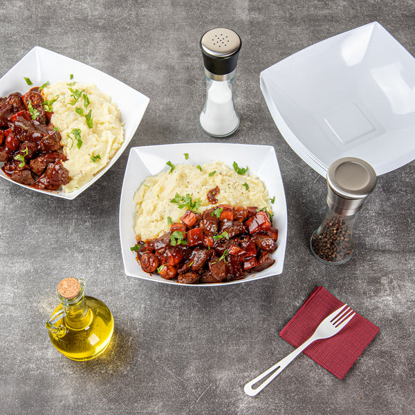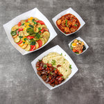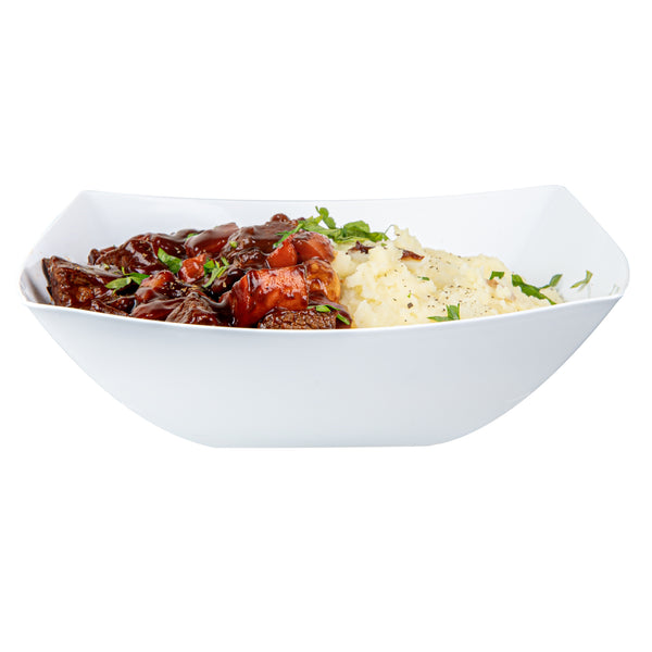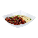 Enhance your dining experience with our Moderna 64-ounce Square White Plastic Serving Bowls. Crafted from durable polystyrene, these plastic bowls are designed to effortlessly accommodate generous portions without breaking. For serving ramen or chilled broth effortlessly, these disposable plastic bowls are suitable for all kinds of warm and cold foods up to 150F. The greaseproof feature of these white plastic bowls ensures that no oils escape. To simplify the cleaning process, these dinner party bowls are conveniently disposable. Plus, these heavy-duty plastic bowls are recyclable, promoting sustainability. The white finish of these salad containers offers a chic touch to the delectable contents within. Measuring 9.75 inches in length by 9.75 inches in width by 3 inches in height, each square bowl has a capacity of 64 ounces. Shipped in a 10 count box.
