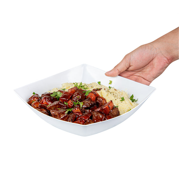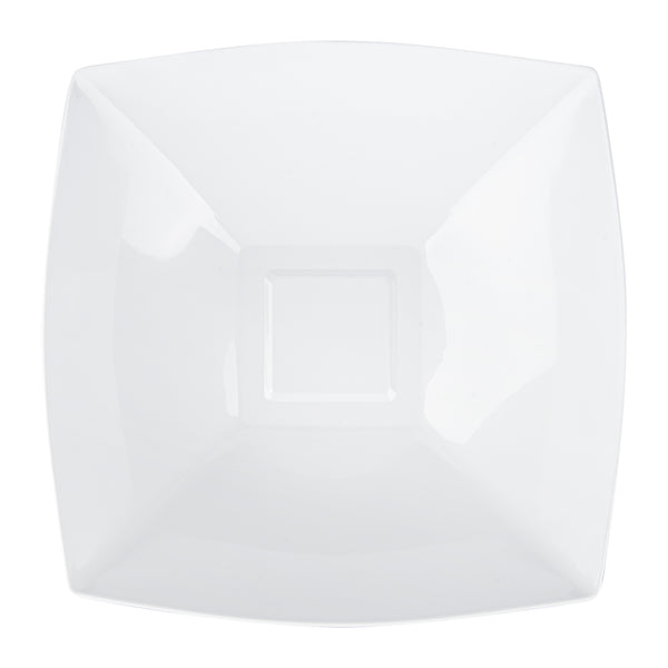 Offer stylish and practical food service with our Moderna 64-ounce Square White Plastic Bowls. Constructed from high-quality plastic, these recyclable bowls are well-suited for warm and cold food offerings, from fruit platters to pasta salads. The greaseproof characteristic feature ensures that saucy dishes remain neatly contained, making them ideal for hospitality or catering use. With a temperature resistance of up to 150°F, they are a reliable addition to any foodservice setup. The crisp white finish enhances the visual appeal of meals and blends effortlessly into formal and casual settings alike. Each of these disposable square bowls measures 9.69 inches in length by 9.69 inches in width by 2.95 inches in height and has a capacity of 64 ounces. Sold in a 100 count box.