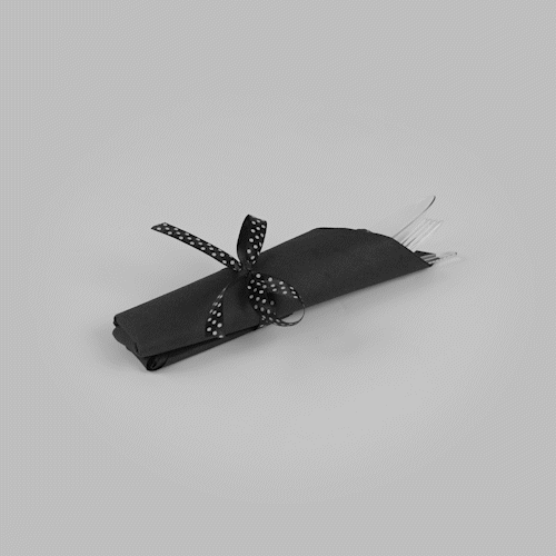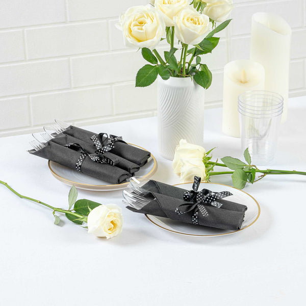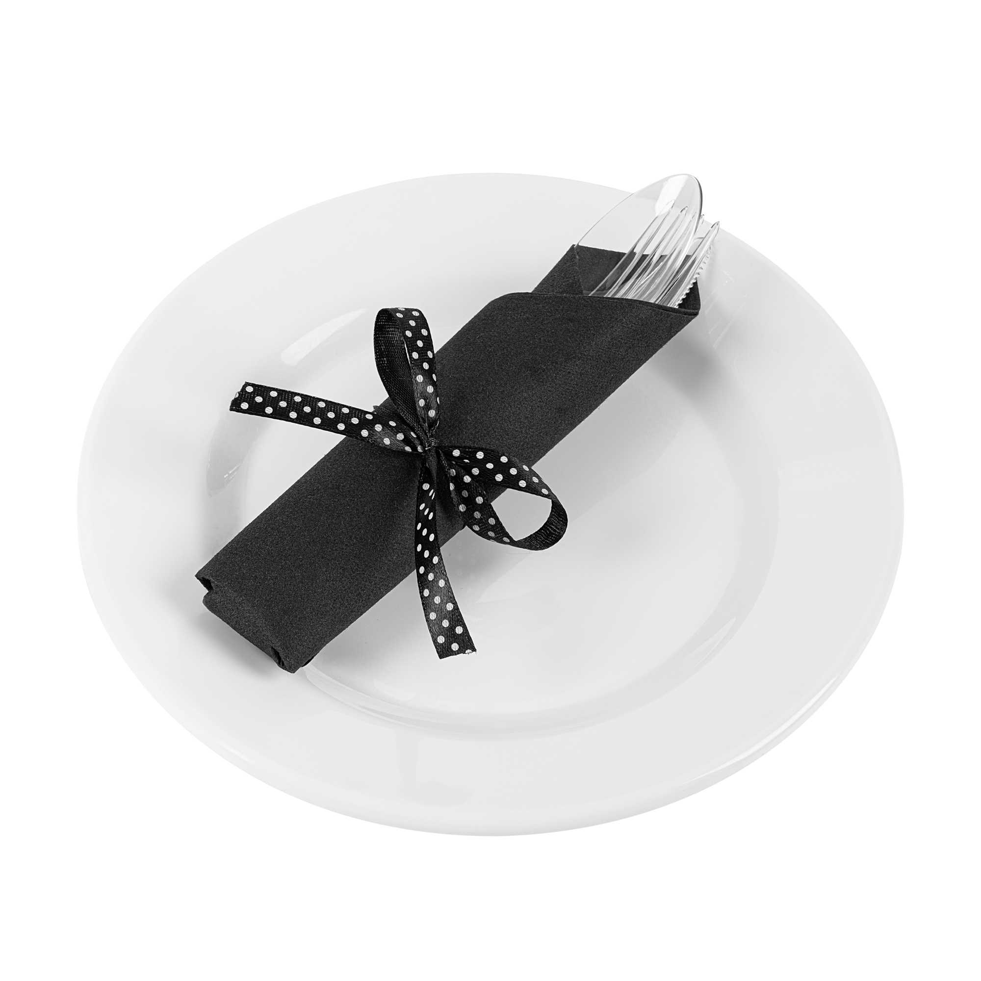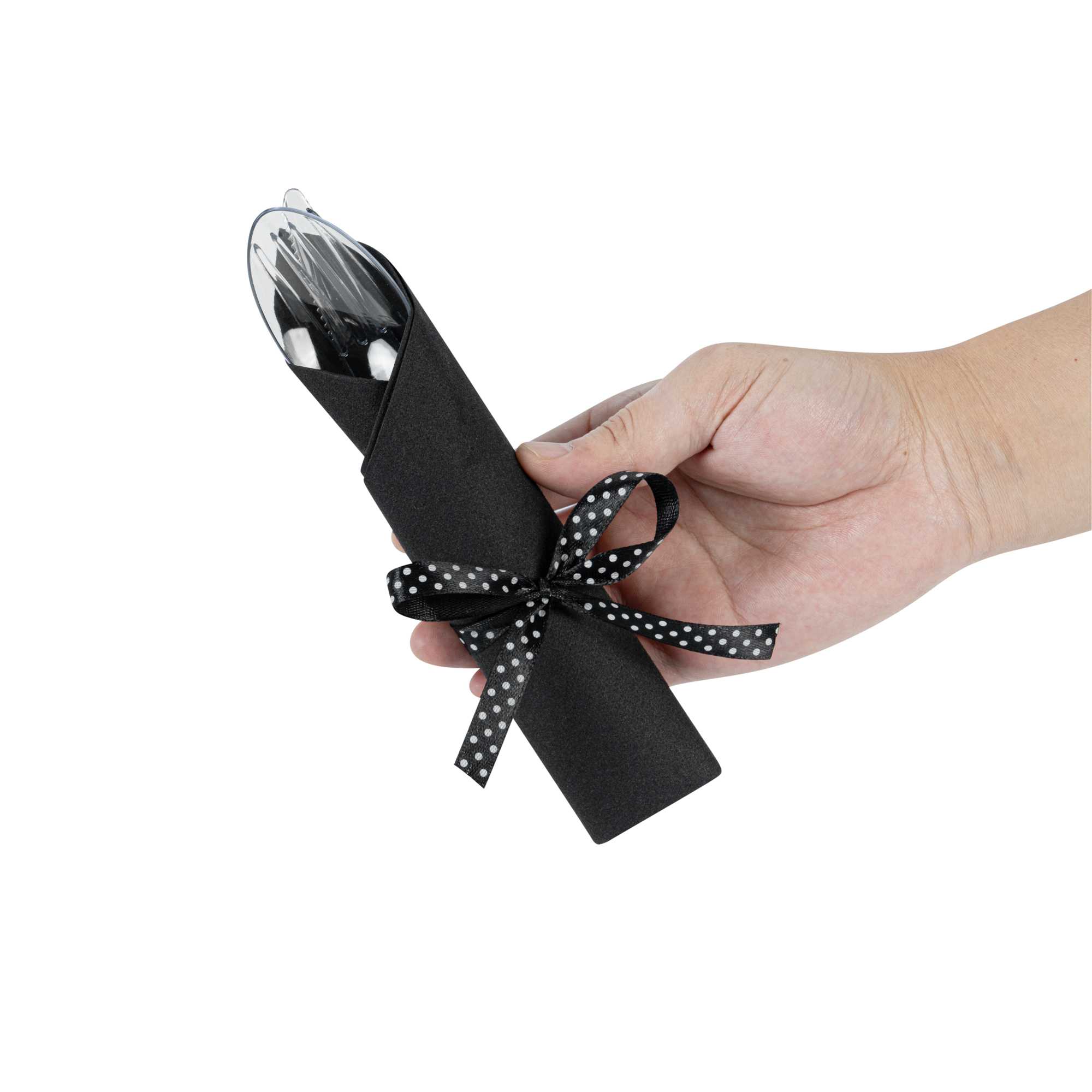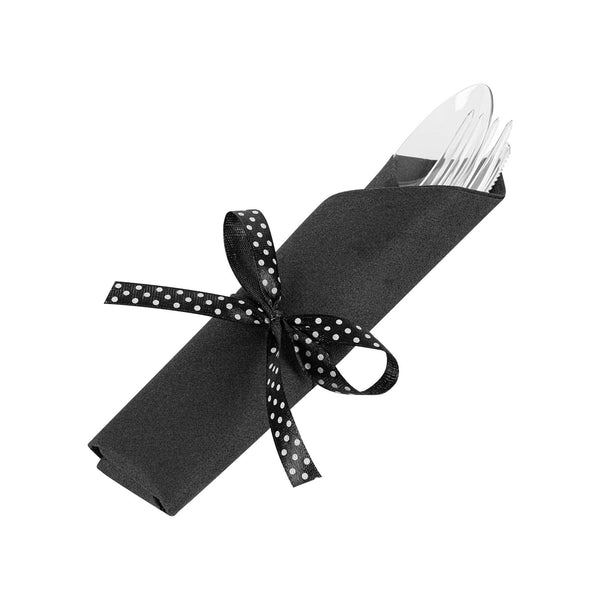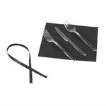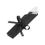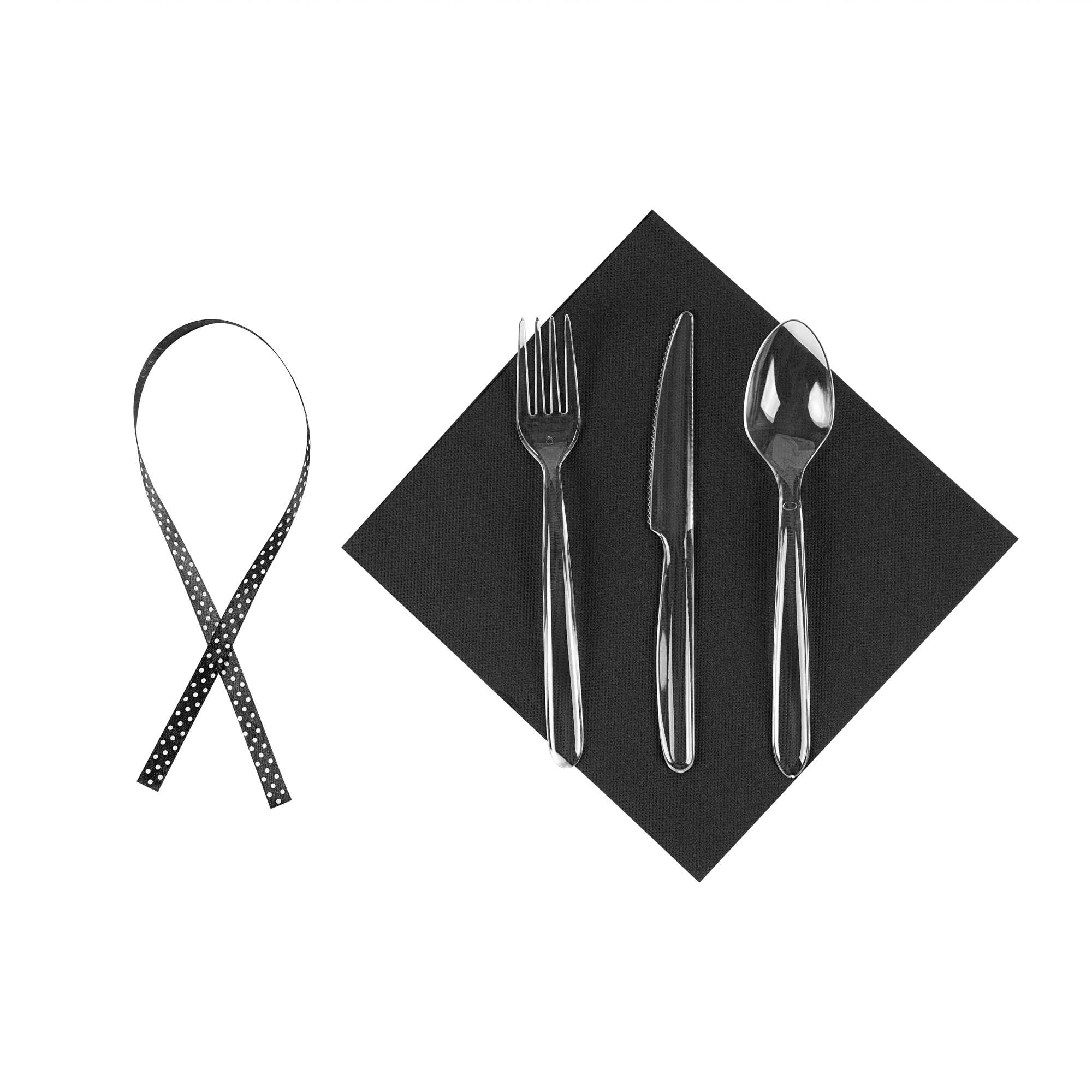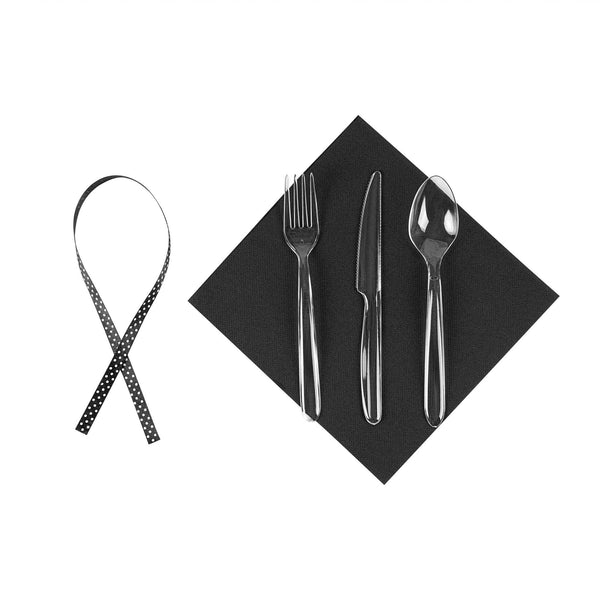 CLEAR PLASTIC CUTLERY SET - WITH BLACK NAPKIN, POLKA DOT RIBBON