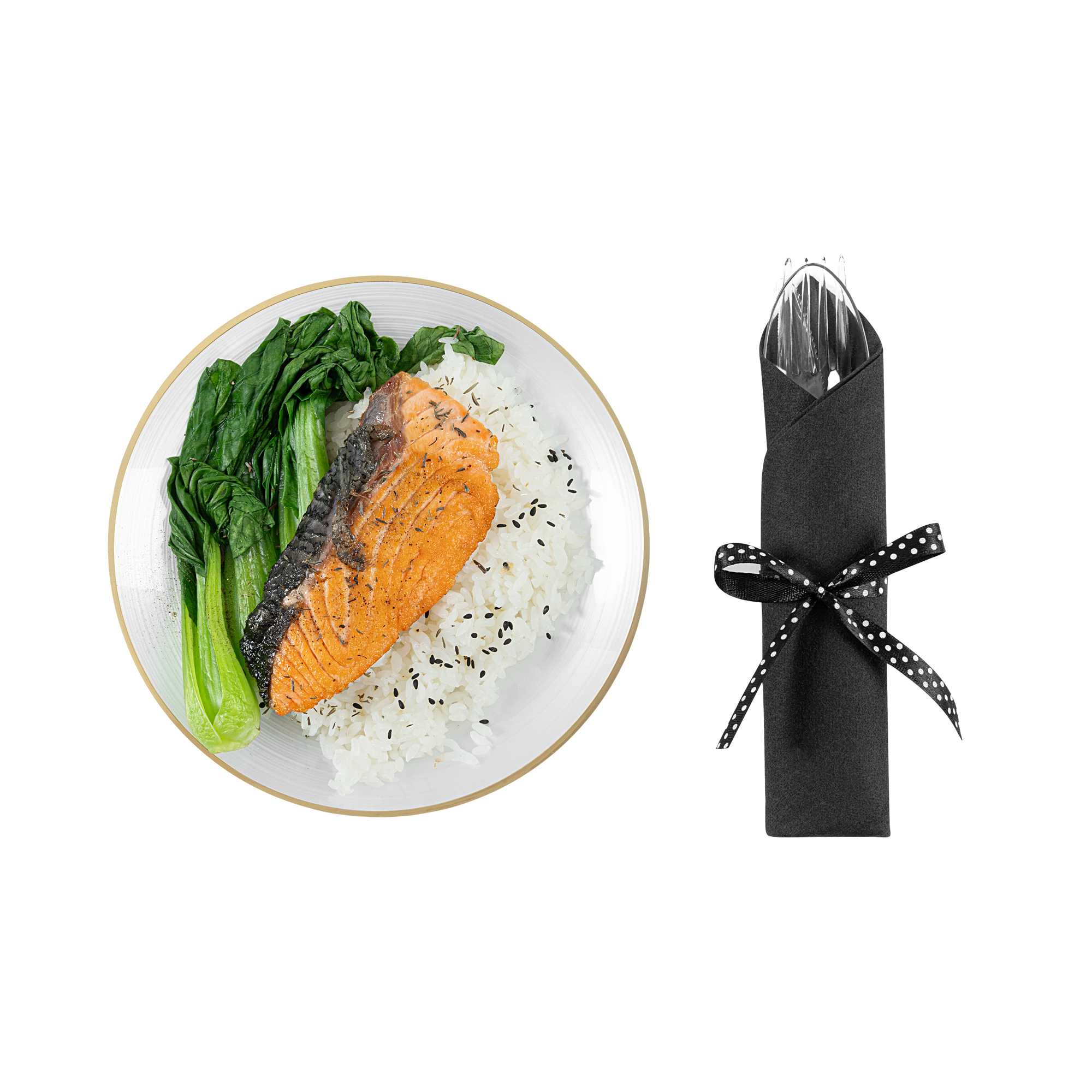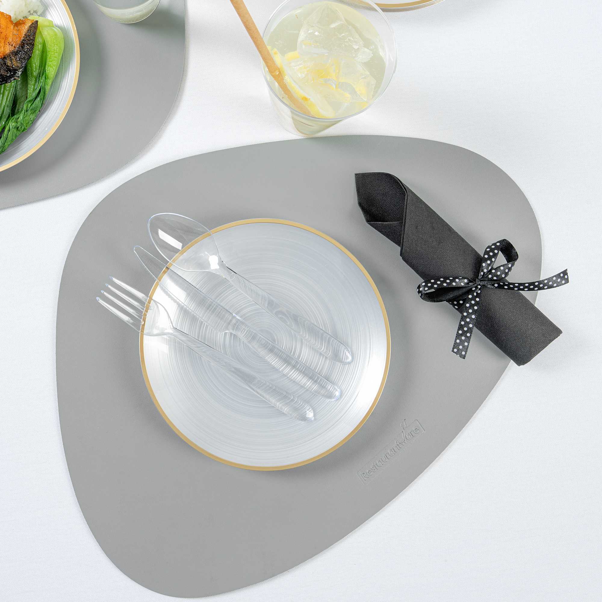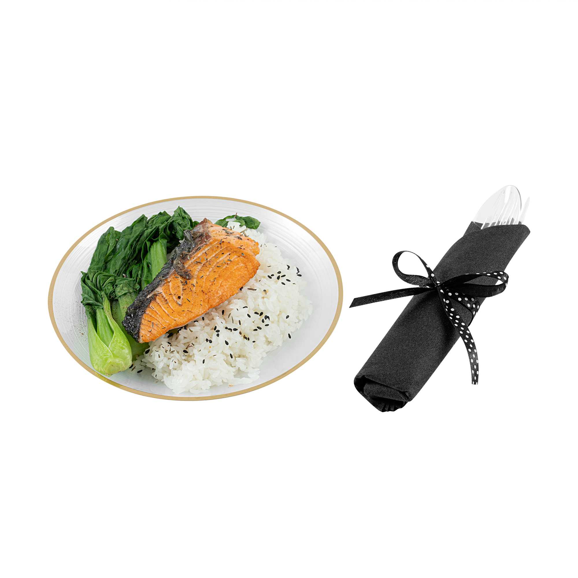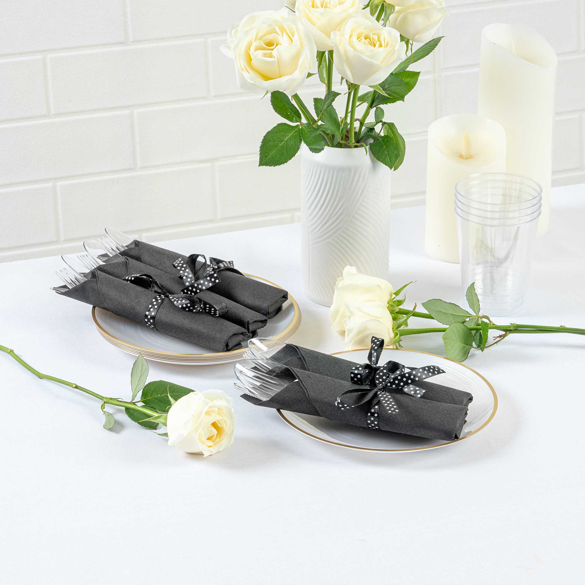 CLEAR PLASTIC CUTLERY SET - WITH BLACK NAPKIN, POLKA DOT RIBBON