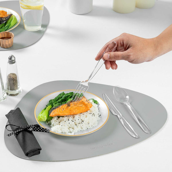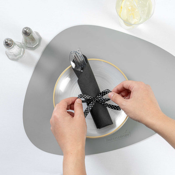 Simplify cleanup and elevate your presentation with the Moderna Recyclable Plastic Cutlery Set. Crafted from durable plastic, this plastic cutlery set is designed for easy post-event cleanup, ensuring that your foodservice operations remain efficient. Its recyclable design makes it an eco-friendly choice, while the cold food-friendly construction allows you to serve salads and desserts with confidence. Each disposable utensils set includes a napkin and is elegantly tied with a charming polka-dotted ribbon, providing an upscale presentation for banquets, catering events, or casual gatherings. Measuring 7.25 inches in length and 2 inches in width, this plastic fork knife spoon set is perfect for both wet and dry foods, offering versatility and reliability in every use. Make a sustainable choice without compromising on quality or style. Each order includes 100 Moderna Recyclable Plastic Cutlery Sets.