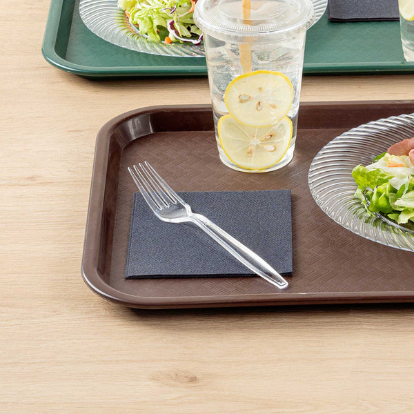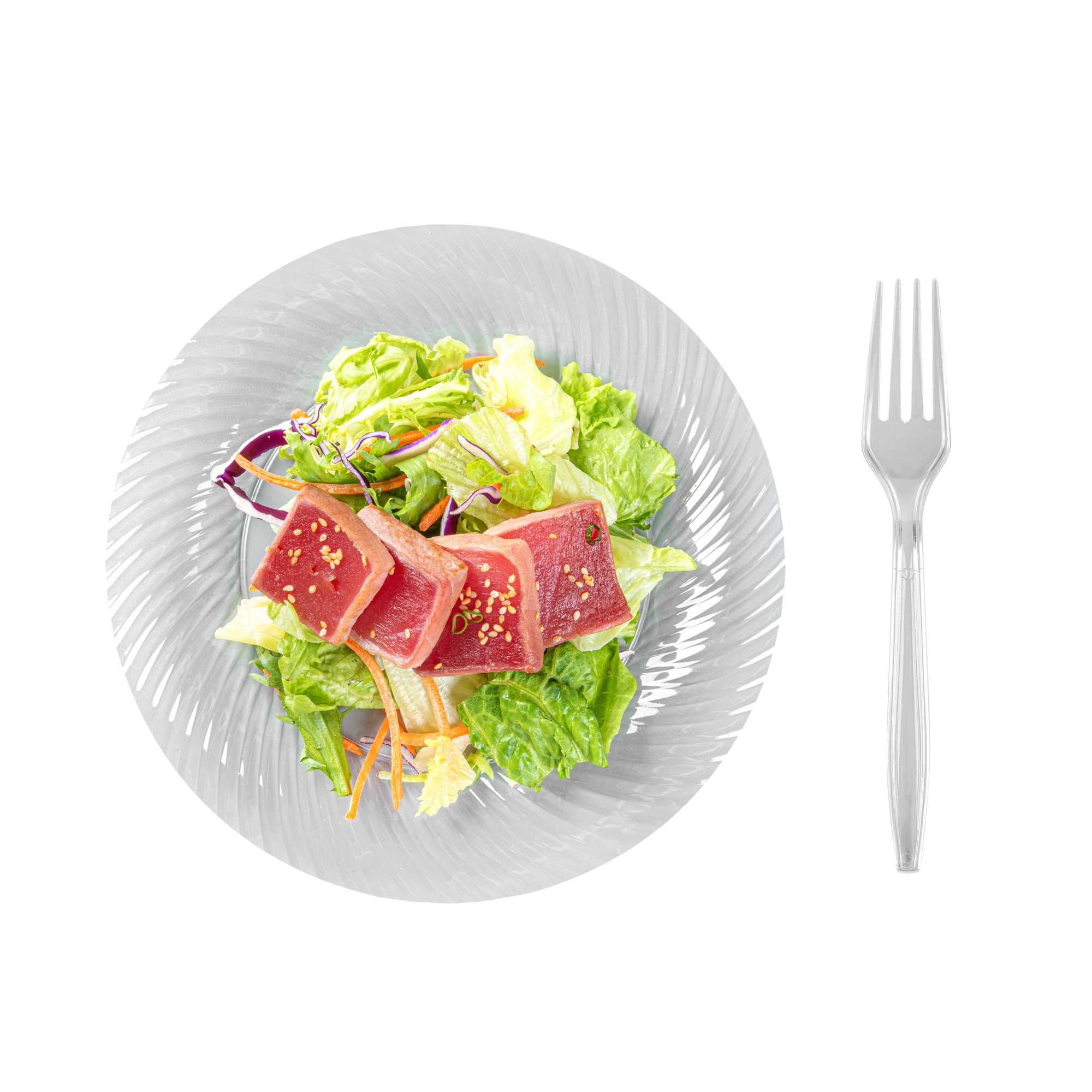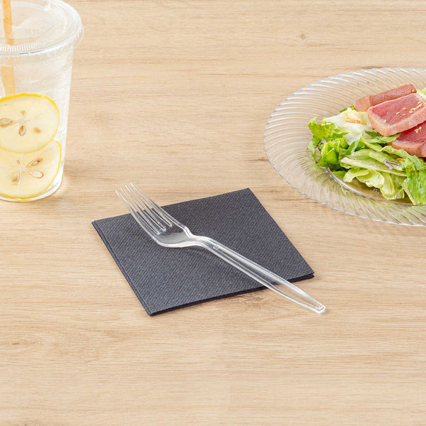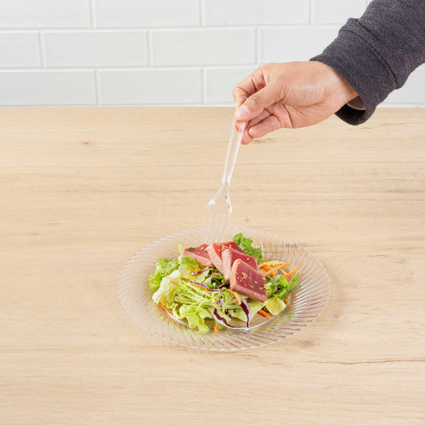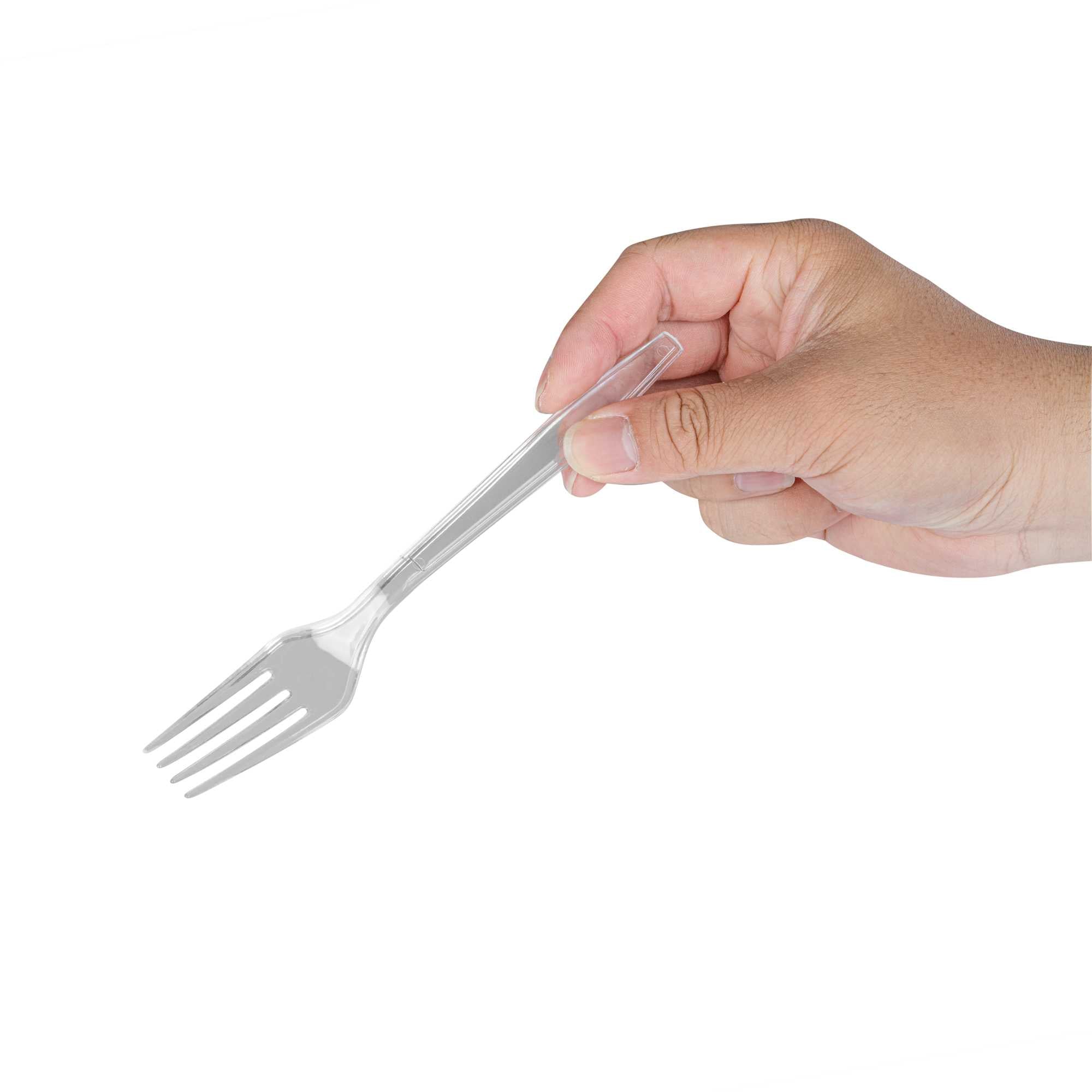 Elevate your dining experience with our Moderna Clear Plastic Forks. Crafted from high-quality plastic, these durable forks are recyclable, allowing you to make a sustainable choice. With their durable construction, these premium plastic forks excel at serving cold foods, maintaining their strength and integrity under pressure. Simply dispose of these single-use forks after use, eliminating the need for washing and drying. Featuring a clear finish, these disposable clear forks offer an elegant and sophisticated disposable flatware solution. Measuring 7.25 inches in length, these clear plastic utensils add a classy touch to your tablescapes. Sold in a 2000 count box.