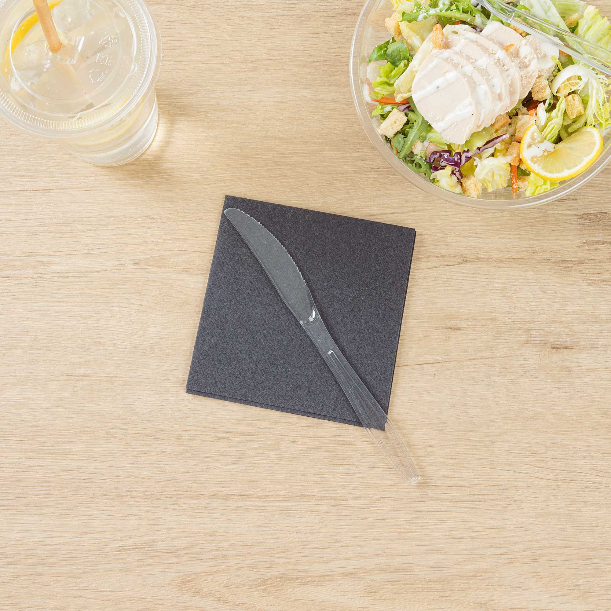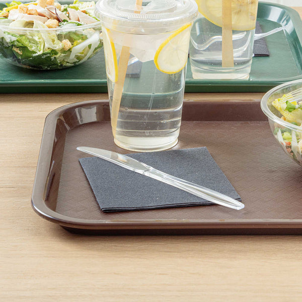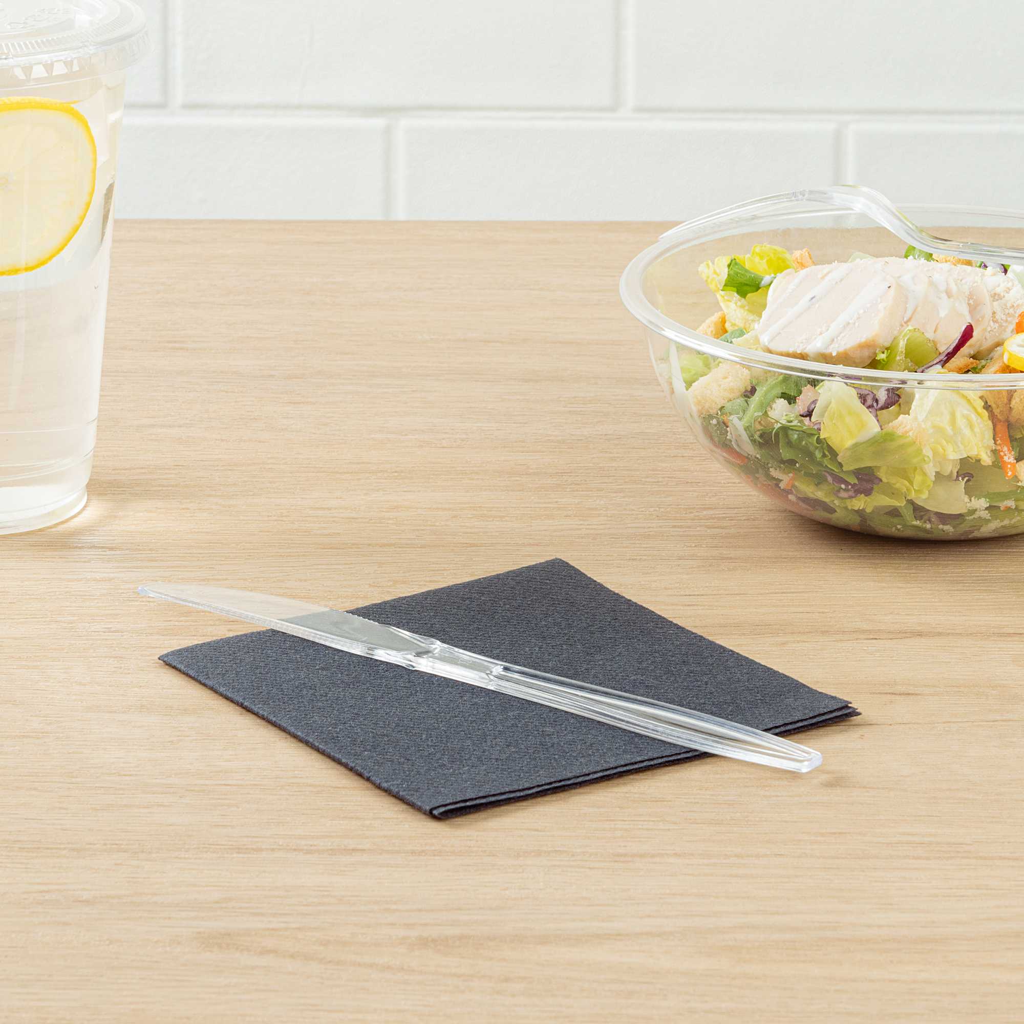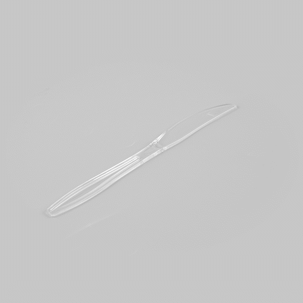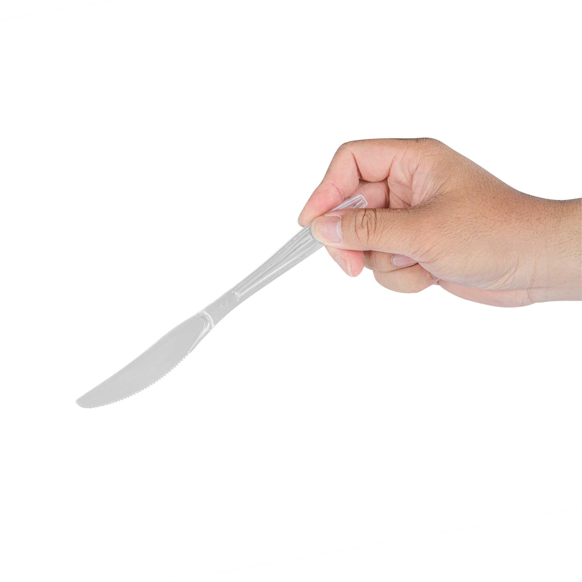 Serve convenience with good food with our Moderna Clear Plastic Knives. Combining sleek design with heavyweight plastic construction, these disposable knives are an ideal option for any food truck, bistro, cafeteria, or fast-casual restaurant. This heavy-duty plastic silverware works to resist bending or cracking during use to provide your customers with an enjoyable dining experience. Each plastic knife is designed with a subtly rounded handle and a serrated cutting edge to provide optimum comfort and performance. Featuring a crystal clear finish, these plastic knives will easily match your existing disposable tableware to present an attractive and seamless look. These clear plastic knives measure 7.25 inches in length. Shipped in a 250 count box.