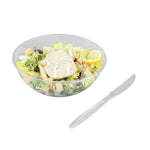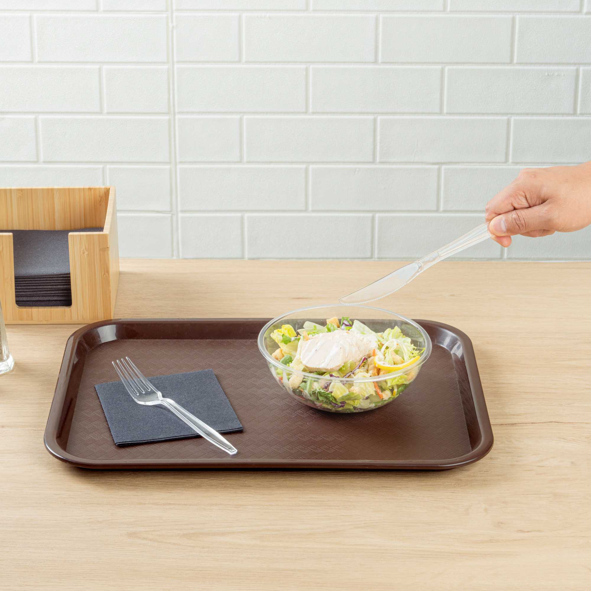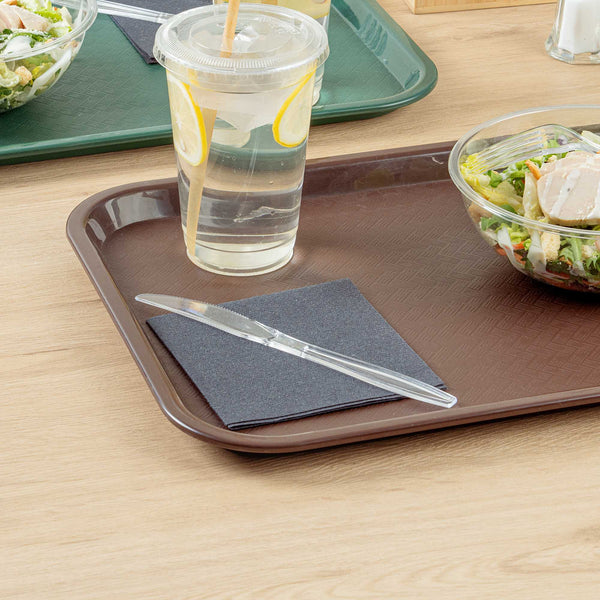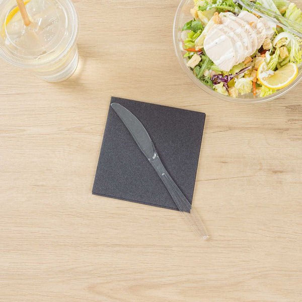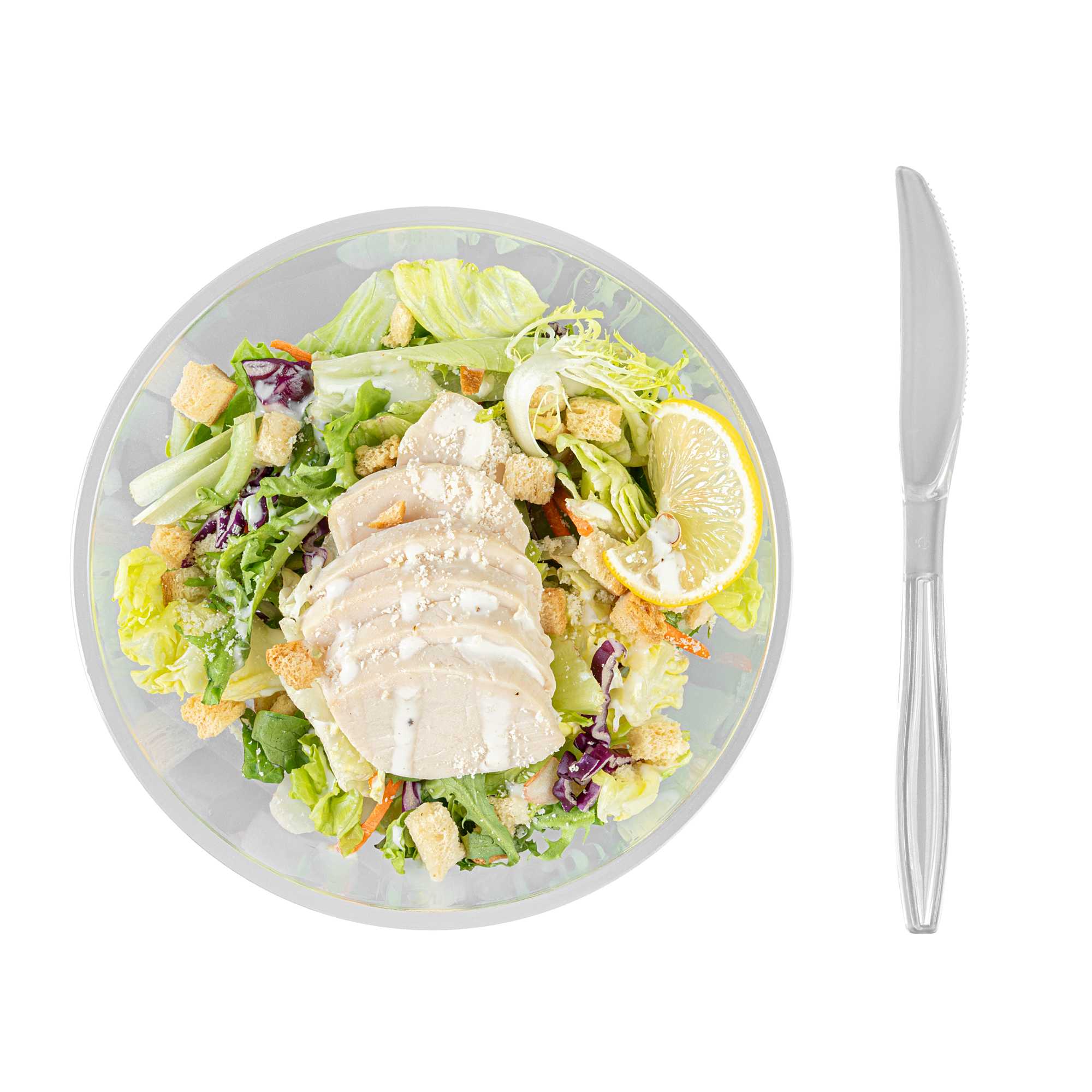 Serve convenience with good food with our Moderna Clear Plastic Knives. Combining sleek design with heavyweight plastic construction, these disposable knives are an ideal option for any food truck, bistro, cafeteria, or fast-casual restaurant. This heavy-duty plastic silverware works to resist bending or cracking during use to provide your customers with an enjoyable dining experience. Each plastic knife is designed with a subtly rounded handle and a serrated cutting edge to provide optimum comfort and performance. Featuring a crystal clear finish, these plastic knives will easily match your existing disposable tableware to present an attractive and seamless look. These clear plastic knives measure 7.25 inches in length. Shipped in a 250 count box.