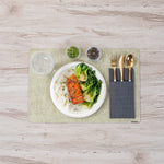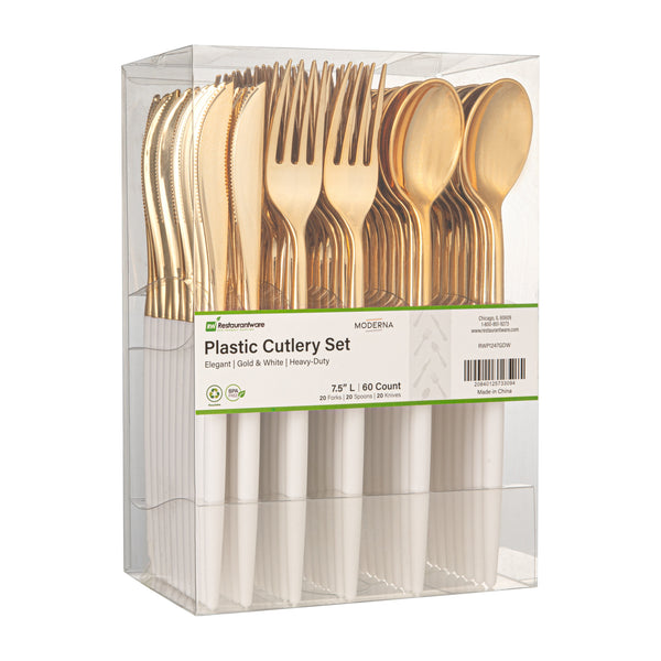 Experience the epitome of elegance with our extraordinary Moderna Gold Plastic Cutlery Sets. These meticulously curated cutlery sets comprise knives, forks, and spoons crafted from premium polystyrene plastic, ensuring durability and refinement. The reinforced white handle design of these gold plastic utensils ensures their strength, making them perfectly suited for indulging in hard foods. This durable utensil set withstand temperatures up to 167F. The sleek gold finish of these plastic flatware sets adds a touch of sophistication to your table decor, effortlessly enhancing its visual appeal. With 20 forks, 20 knives, and 20 spoons included, these sets provide an abundant supply of utensils for your large events. Embrace convenience with these disposable flatware sets, allowing for swift disposal after your gatherings, ensuring a hassle-free cleanup process. Each plastic cutlery piece measures 7.5 inches long to maneuver foods easily. Shipped in a 500 count box.