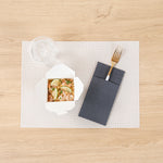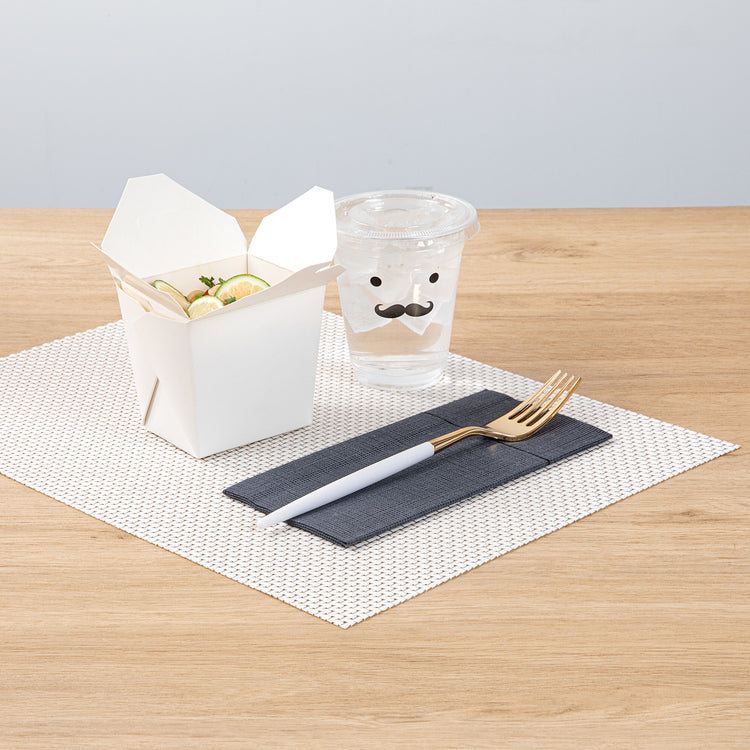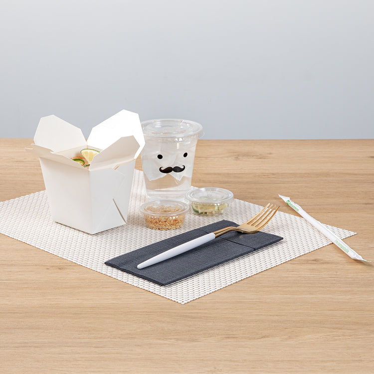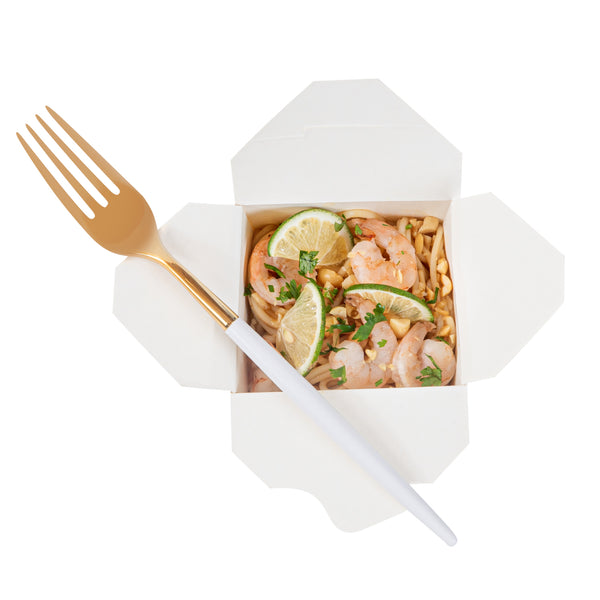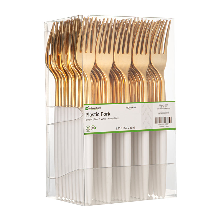 Bring a touch of luxury to your daily meals with our Moderna Gold Plastic Forks. Crafted with stability, these plastic forks are constructed from durable polystyrene plastic, making them exceptionally good at piercing hard foods. These plastic cutlery are, ensuring no harmful substances find their way into your food. Showcasing their versatility, these gold forks can withstand temperatures up to 167F, accommodating a wide range of warm and cold dishes. These gold plastic forks with white handles are recyclable and enable you to make a positive impact on the environment. Designed for your convenience, these fancy plastic silverware pieces offer seamless disposal, particularly suited for large events. Exuding sophistication, these fancy plastic utensils feature a striking gold and white finish, adding an elegant touch to your tablescape and enhancing its overall allure. Each utensil in this party cutlery set measures 7.5 inches long. Shipped in a 500 count box.