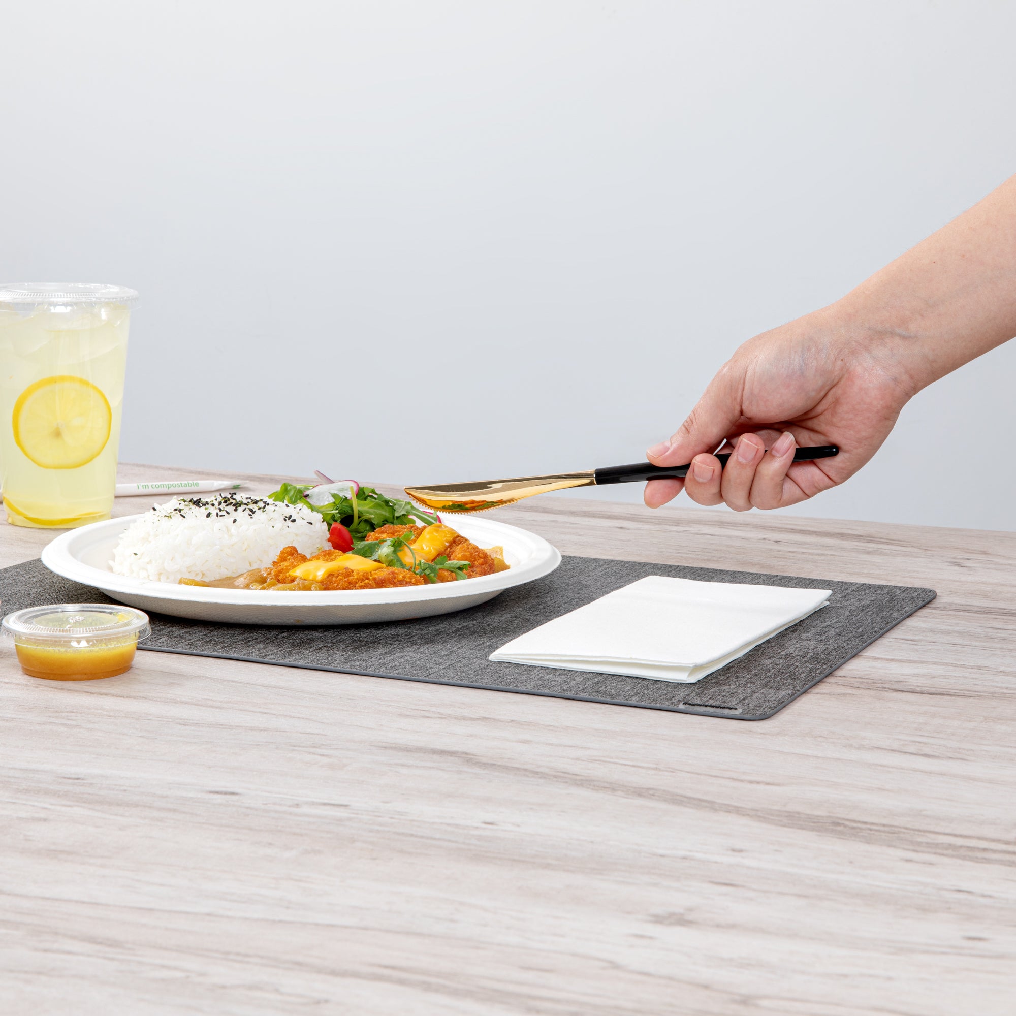 Spread butter and jam easily over your bread slices using our Moderna Gold Plastic Knives. Made from top-quality polystyrene plastic, these recyclable knives for desserts are durable and do not bend or break while using them. With a smooth black-finish handle, these disposable knives provide you with a firm grip while cutting your meat. The serrated edges of this plastic cutlery let you slice cakes easily without having to apply much pressure. These disposable plastic knives come in a royal golden shade to serve your dishes in style. Each of these plastic knives measures 7.75 inches in length and is ideal for hot or cold foods up to 167F. Sold in a 50 count box.