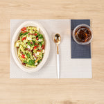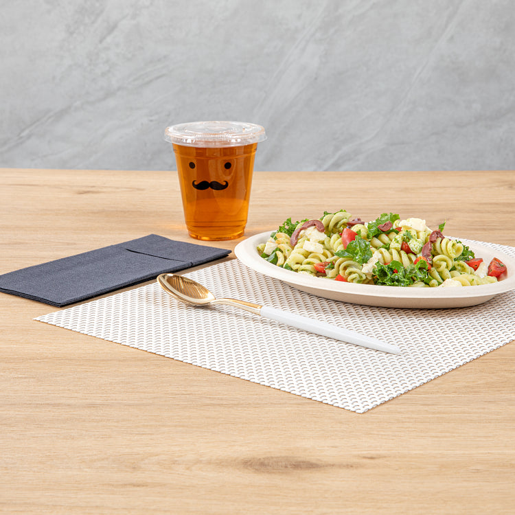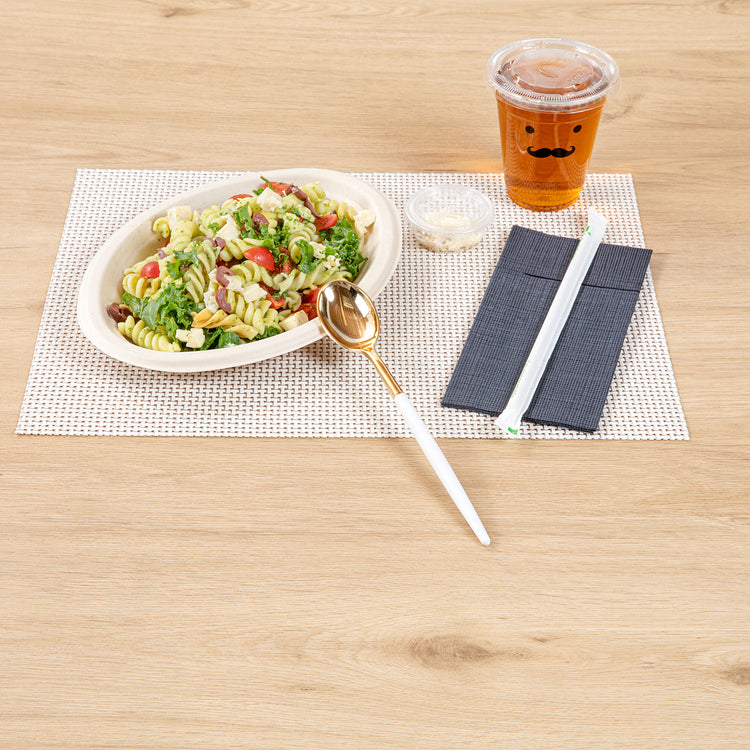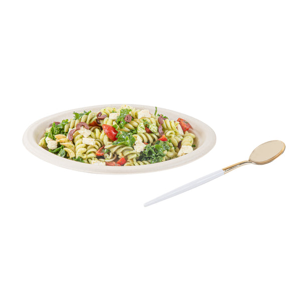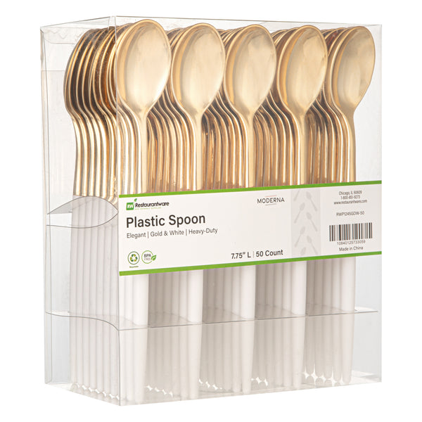 Transform your table into a visual delight with our Moderna Gold Plastic Spoons. Skillfully crafted from durable polystyrene plastic, these plastic spoons are expertly designed to handle the scooping of various food items. These plastic utensils are, ensuring your meals remain free from harmful substances. With a temperature resistance of up to 167F, these gold dinner spoons accommodate warm and cold dishes with utmost ease. Plus, these gold spoons with white handles are recyclable, providing an eco-conscious option to help minimize your carbon footprint. Designed for your convenience, these fancy plastic silverware pieces are crafted for effortless disposal, making them a perfect choice for large events and gatherings. Adorned with luxurious gold and white finish, these fancy plastic utensils add a touch of refinement to your tablescape. Each plastic cutlery piece measures 7.75 inches long to easily maneuver foods. Shipped in a 50 count box.