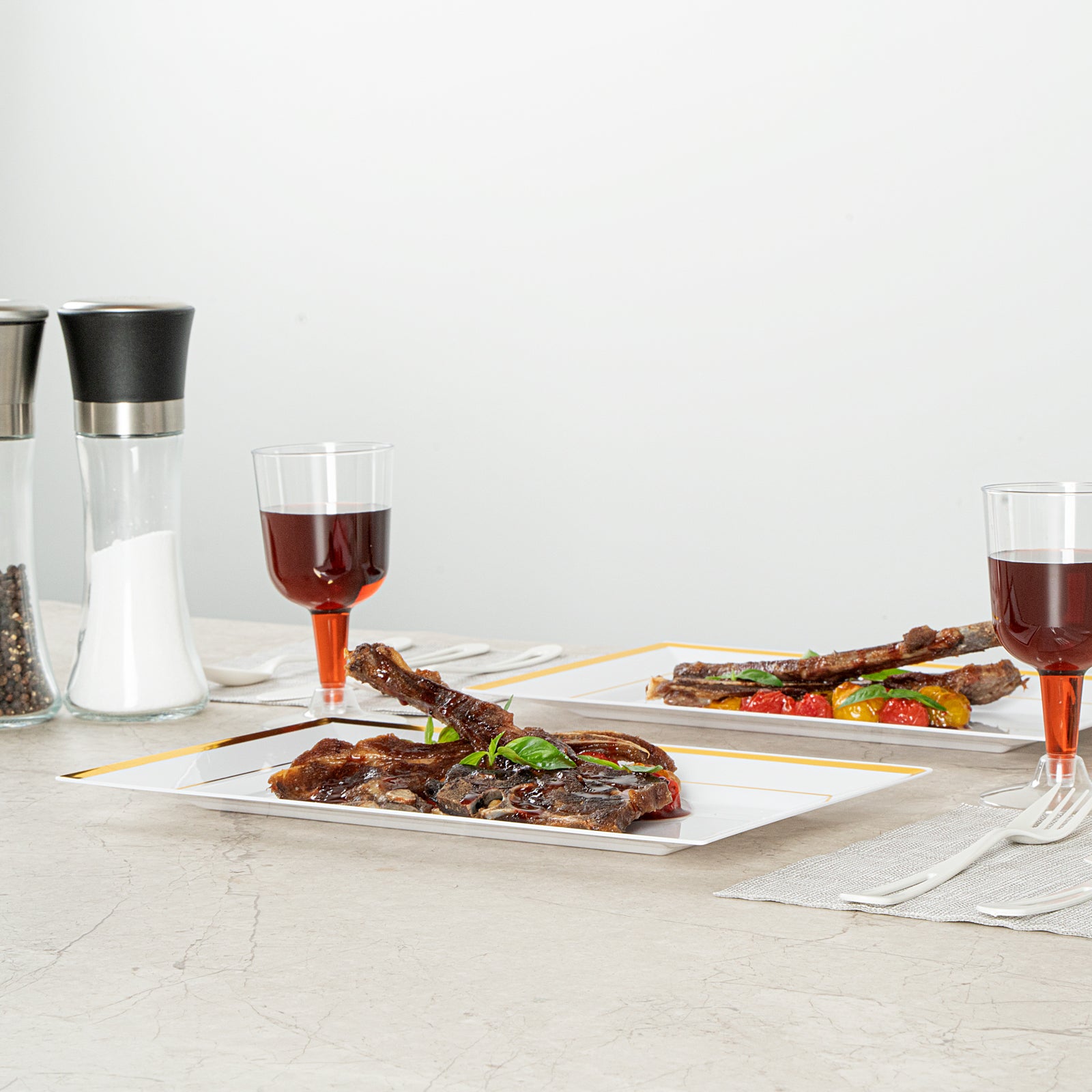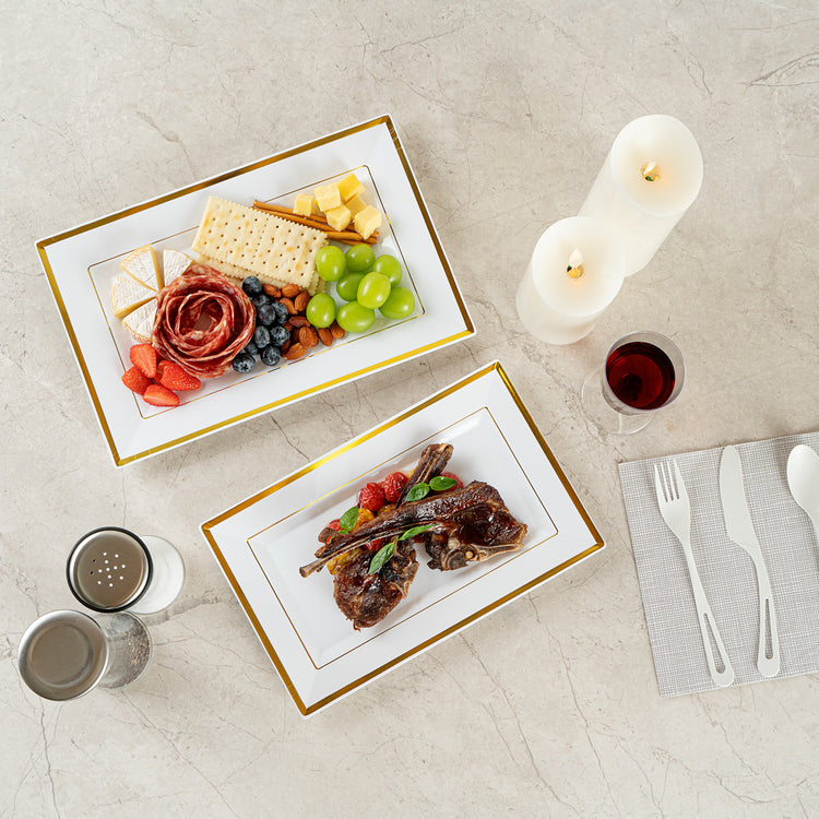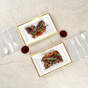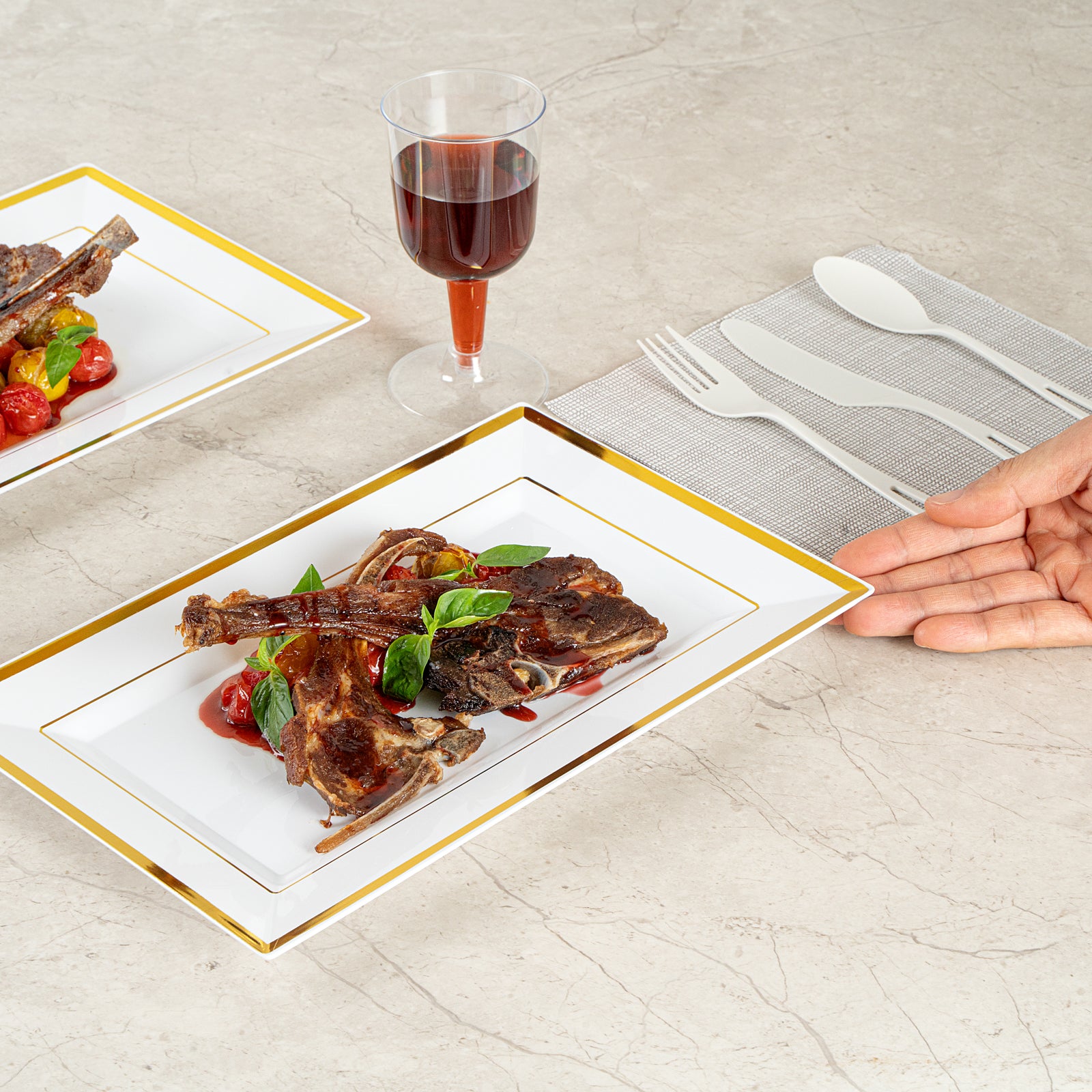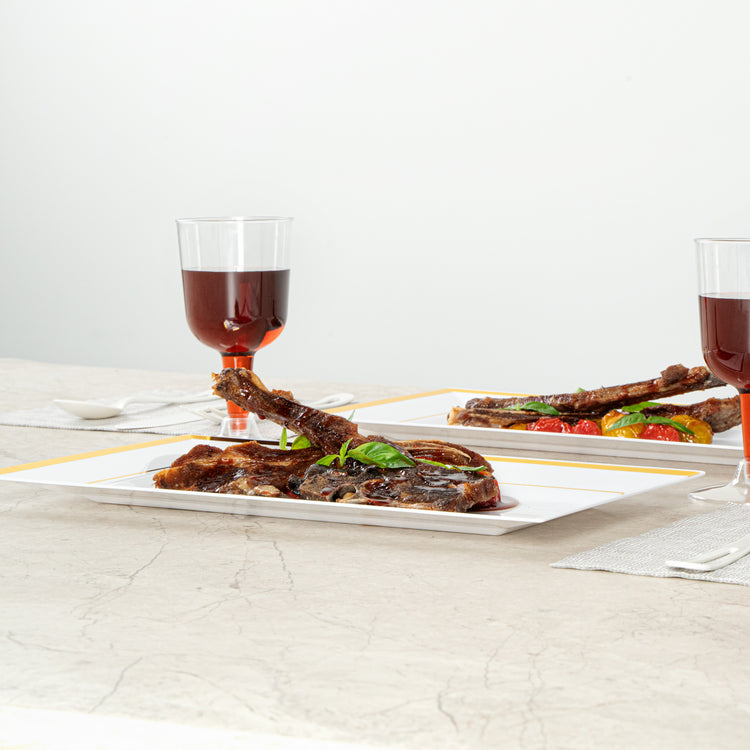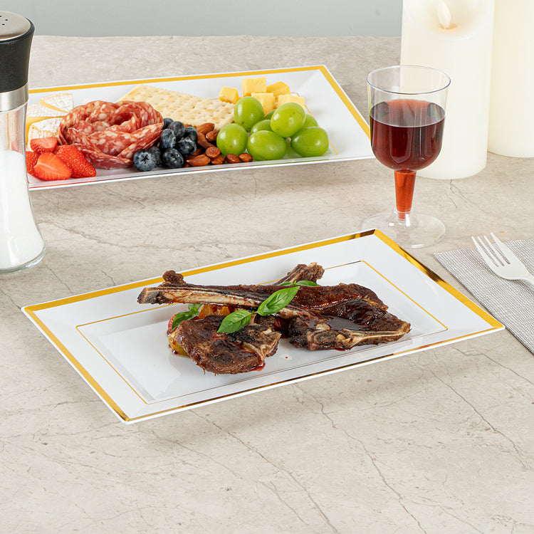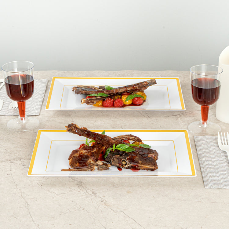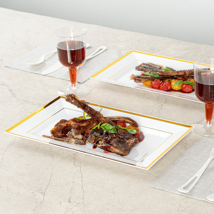 Enhance your dining experience with elegant disposable plates. The Moderna Rectangle White Plastic Gold-Rimmed Plates are crafted from premium plastic, providing a durable and break-resistant solution for events. Their greaseproof surface ensures pastries and other delicacies maintain a pristine presentation, ideal for upscale catering. With a cold food-friendly design, these plates preserve the freshness of salads and desserts, making them perfect for versatile menu offerings. Measuring 11.5 inches by 7.25 inches, they accommodate entrees and sides efficiently, optimizing serving space. The white gold rim plates add a sophisticated touch to your tablescape, elevating the aesthetic of any environment. As a recyclable option, they offer an eco-friendly alternative to traditional disposables, aligning with sustainability initiatives. Trust these rectangular plastic plates to deliver effortless elegance and reliability at your next event. Each order includes 100 plates.