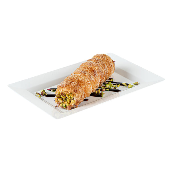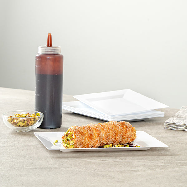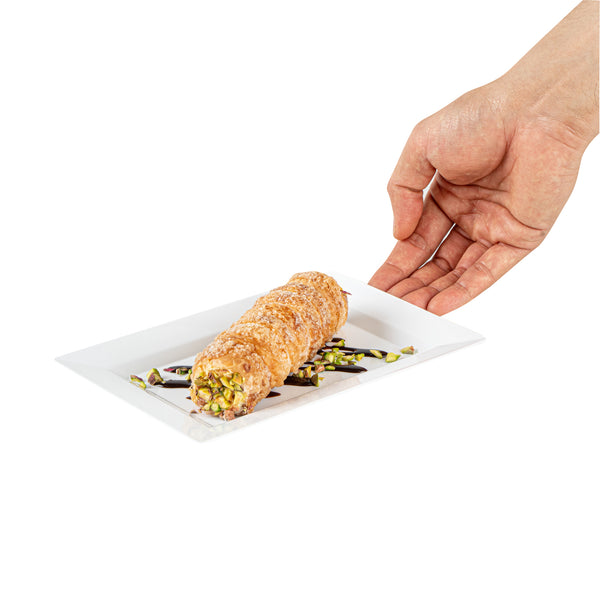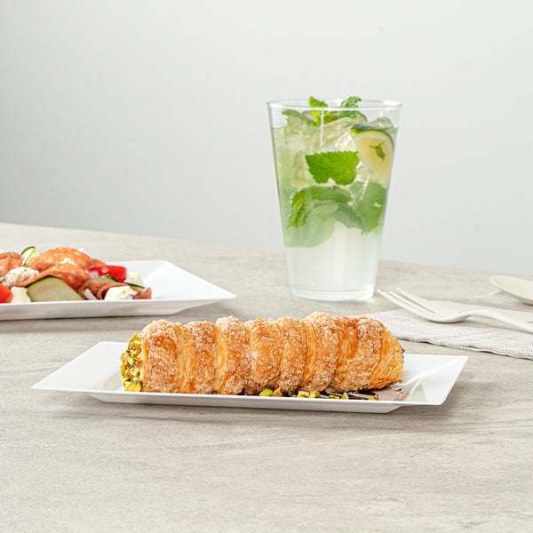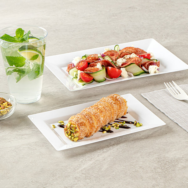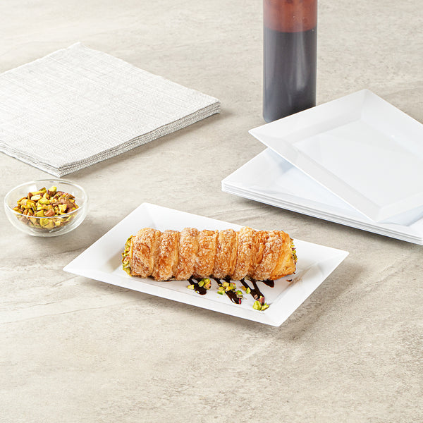 Enhance your food presentation with sleek, disposable tableware. Moderna Rectangular Plastic Plates bring a touch of elegance to any event with their pristine white finish and compact 7.5-inch by 5.25-inch size. The greaseproof surface ensures that pastries remain visually appealing, making these rectangular plastic plates perfect for catering. Designed for versatility, they accommodate both warm and cold dishes, providing an ideal solution for serving chilled desserts and salads at restaurants and cafes. The recyclable material offers an eco-friendly alternative to traditional plastic dinner plates, promoting sustainability in your dining establishment. The minimalist style beautifully complements any tablescape, allowing your culinary creations to take center stage. Maximize your service efficiency and leave a lasting impression with these disposable plastic plates. Each order includes 100 plates.