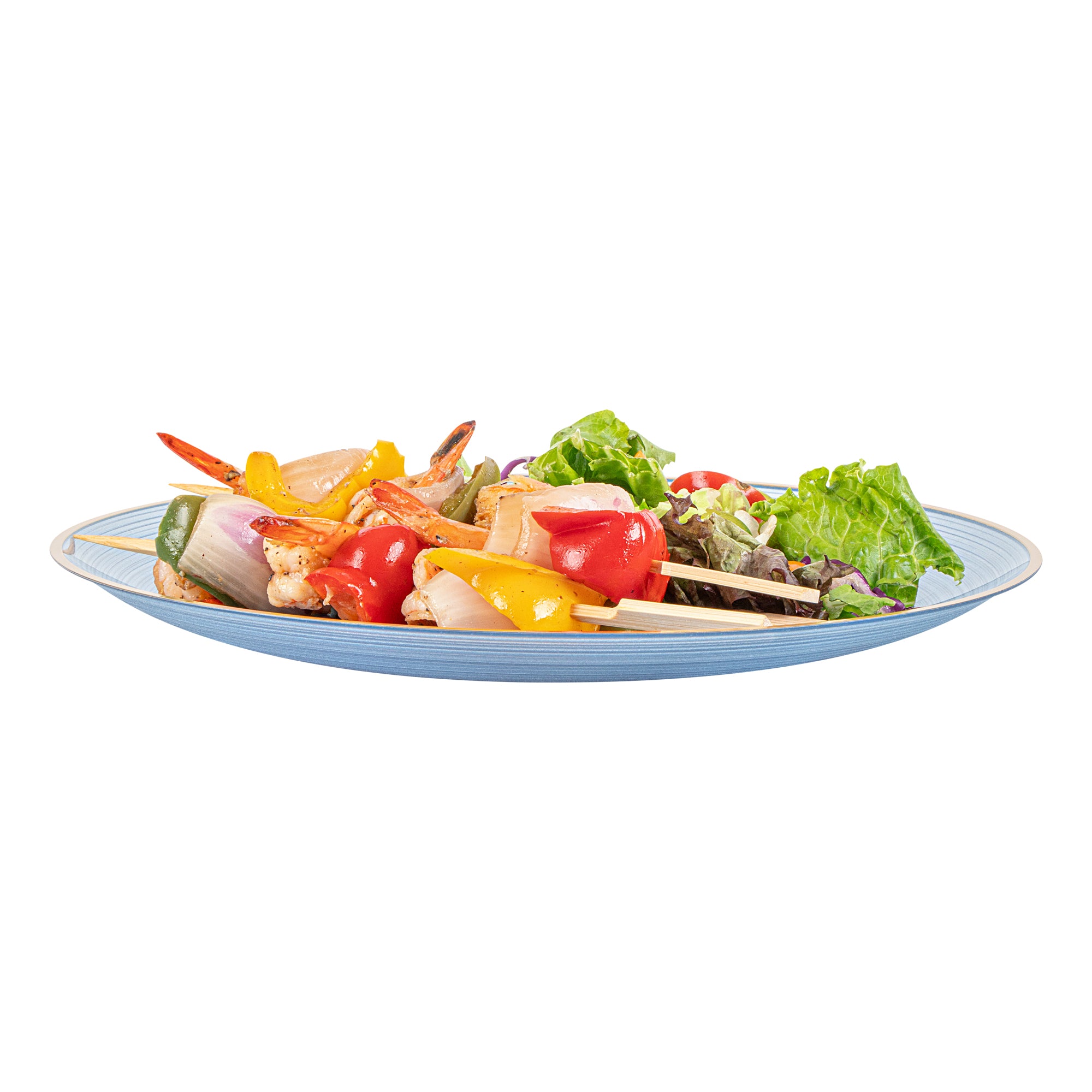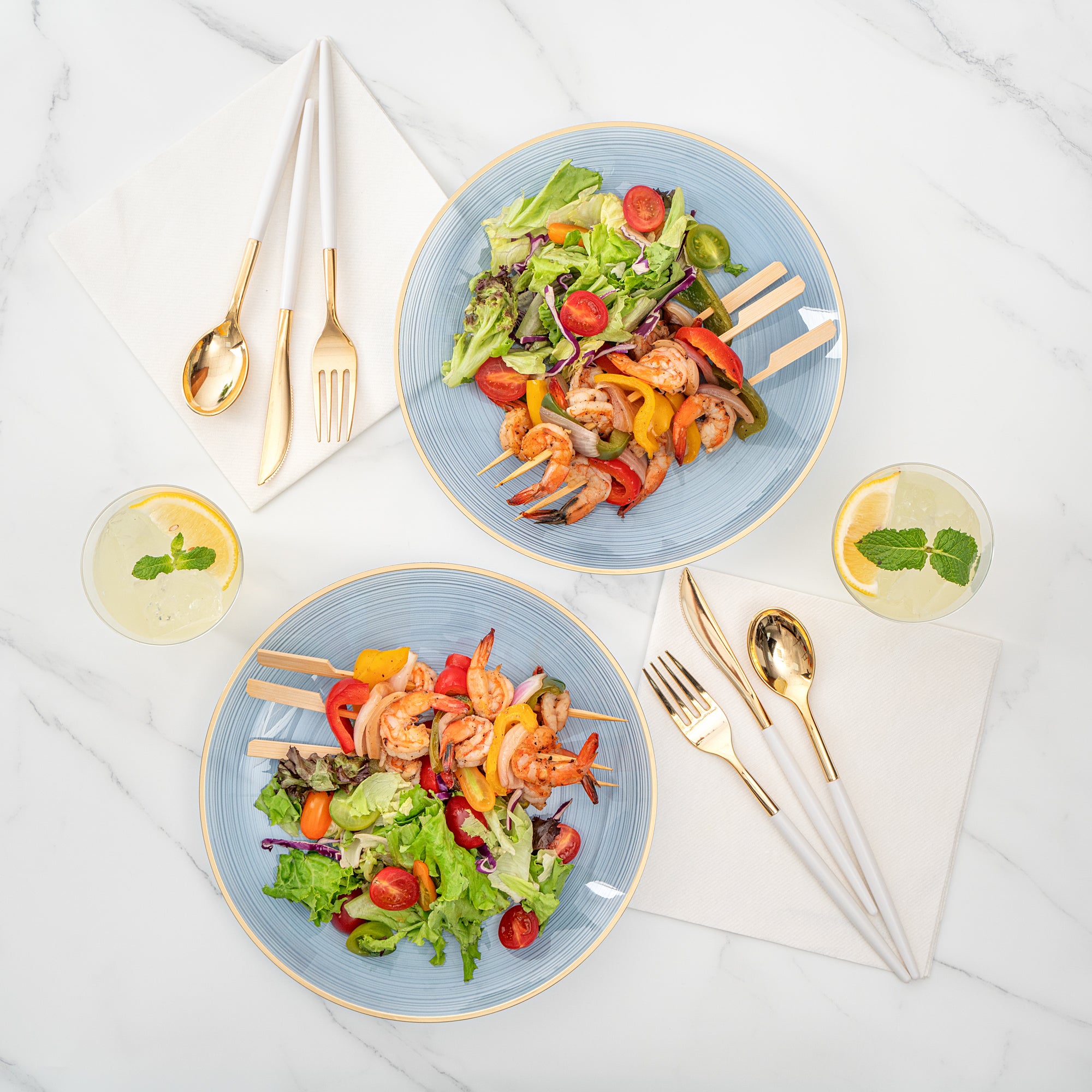 Enhance your event's elegance with crystal plastic plates. The Moderna Crystal Design Disposable Plastic Plates feature a chic, crystal design that elevates table presentation, making them ideal for weddings and upscale gatherings. These gold rimmed disposable plates ensure quick cleanup, saving valuable time after events. With a secure-grip design, these plates prevent spills, providing peace of mind during service. Measuring 10.1 inches in both length and width, they offer ample space for gourmet portions, while the sturdy plastic construction is BPA-free, ensuring safe and reliable use. Perfect for catering events, these plates add sophistication without the hassle of washing dishes. Each order includes 100 Moderna Crystal Design Disposable Plastic Plates.