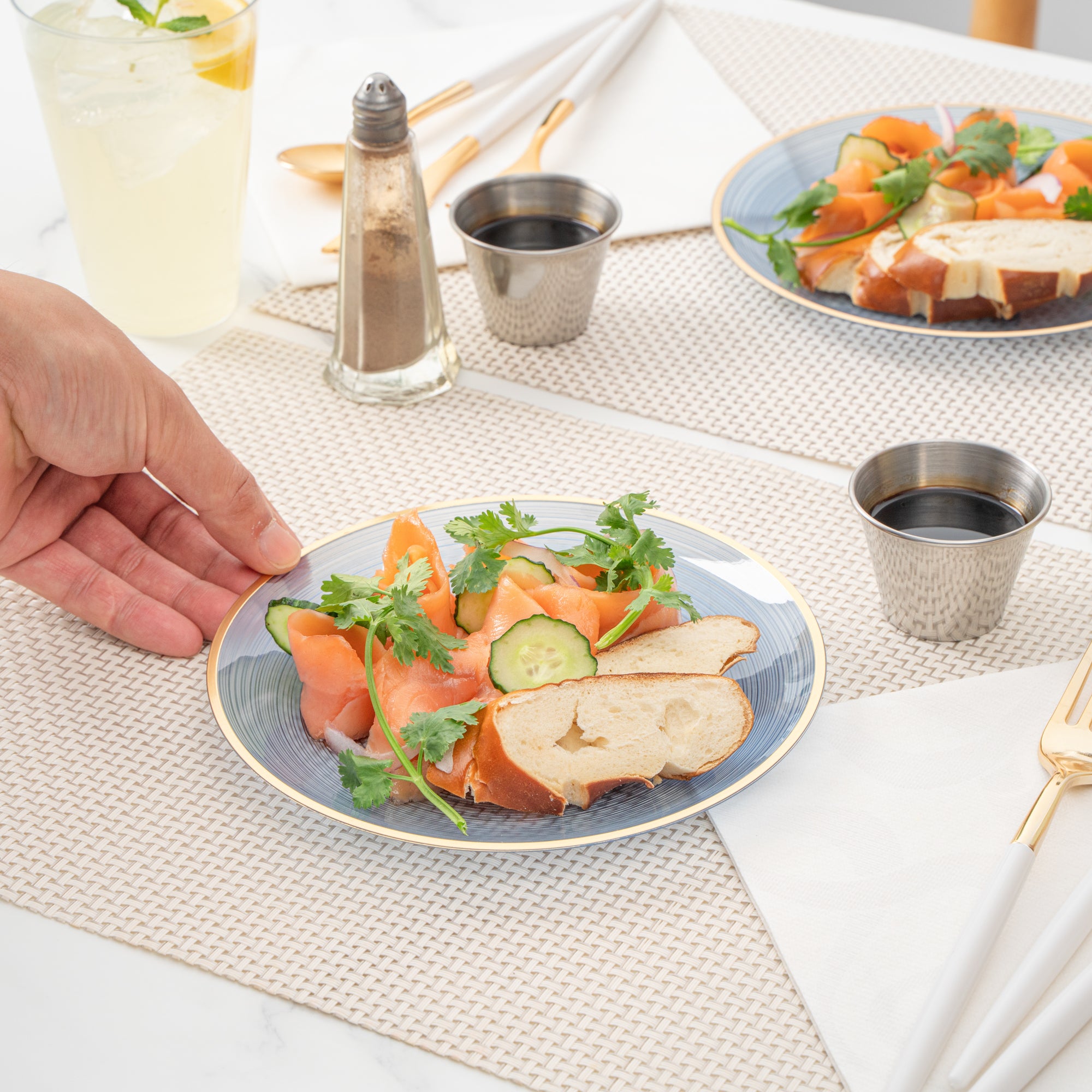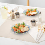 Elevate your dining experience with sophisticated tableware. The Moderna Crystal Design Elegant Party Plates feature a rippled design with a gold rim, enhancing table presentation and adding elegance to any dining setting. Crafted from durable plastic, these elegant party plates ensure reliable use during events, reducing the risk of breakage. The translucent blue color provides a unique and stylish appearance, making them ideal plastic wedding plates that complement various decor themes. With a secure-grip design, these plates prevent accidental spills, adding functionality to their stunning aesthetic. Their 7.13-inch diameter is perfect for serving appetizers, desserts, or small entrees, making them versatile for catering events or banquets. Disposable plates enable quick, efficient cleanup, saving time and labor costs, a benefit highly valued in the foodservice industry. Each order includes 100 Moderna Crystal Design Elegant Party Plates.