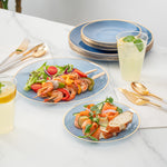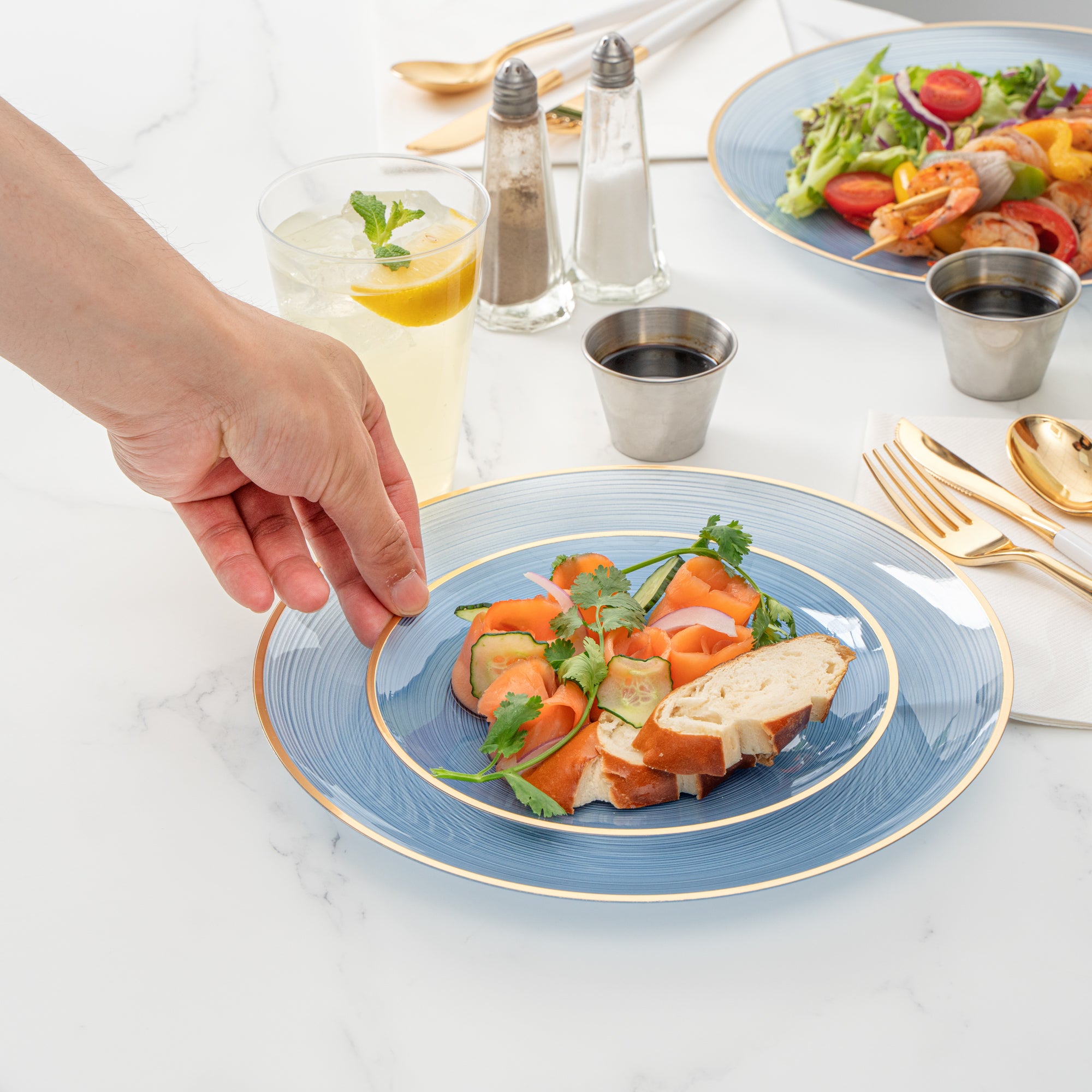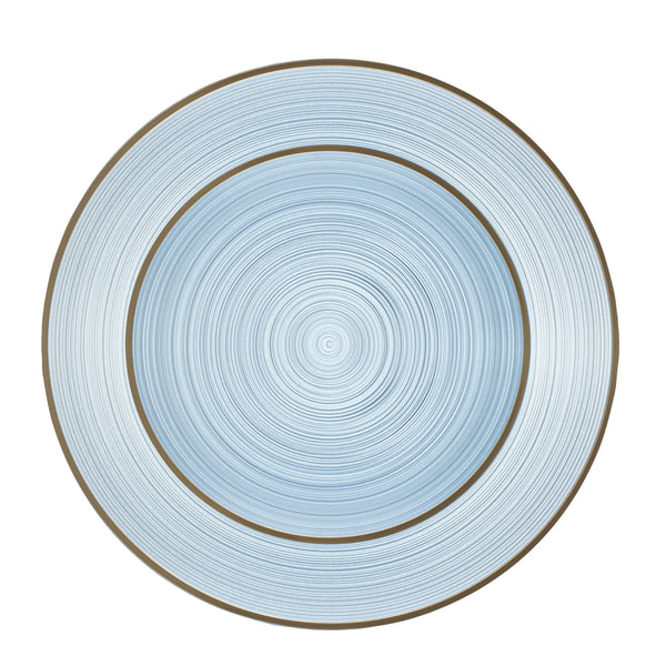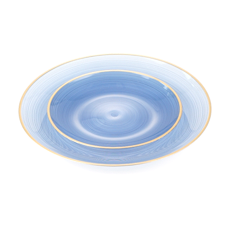 ROUND BLUE TRANSLUCENT PLASTIC GOLD-RIMMED PLATE SET - 7 1/4" AND 10"