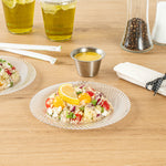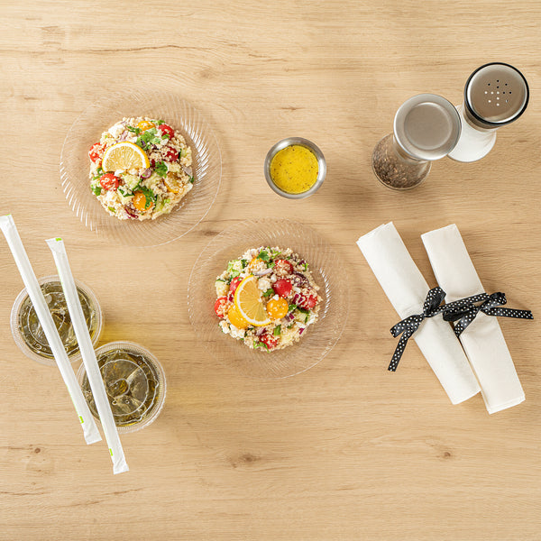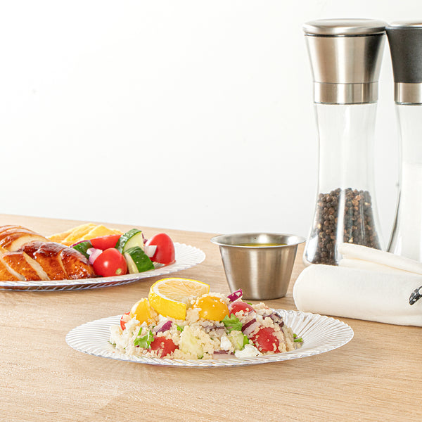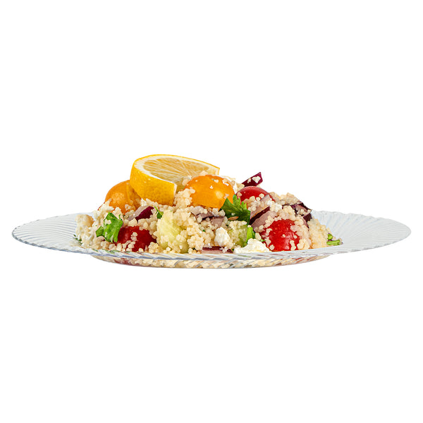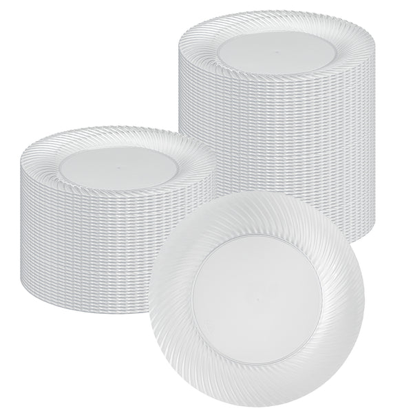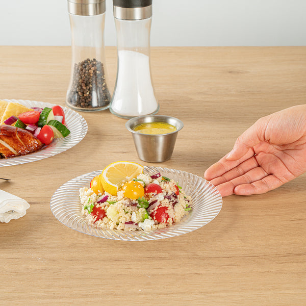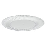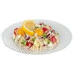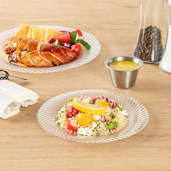 Add a touch of intricacy to your table arrangement with our Moderna Round Clear Plastic Wave Plates. Crafted from durable PS plastic, these dinner plates are built to withstand even the heartiest meals. The exquisite wave pattern adorning these recyclable plastic plates makes them a statement piece in your party table decor. Made from premium plastic, these party plastic plates are eco-friendly and easily recyclable, minimizing their impact on the environment. The sturdy design of these dinner plates ensures resistance to grease, ensuring a mess-free dining experience. With a temperature resistance of up to 150F, these clear plastic plates are perfect for serving a wide range of warm and cold dishes. Designed for convenience, these party plastic plates are disposable, eliminating the hassle of washing dishes. With their sleek clear finish, these greaseproof plastic plates upgrade the presentation of your food, making it even more appealing. Measuring 7 inches in diameter, these disposable plates for weddings are suitable for serving various appetizers, main courses, and desserts. Shipped in a 200 count box.