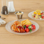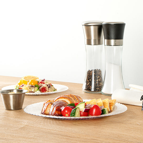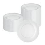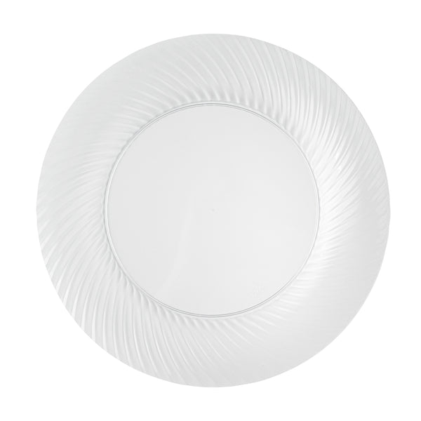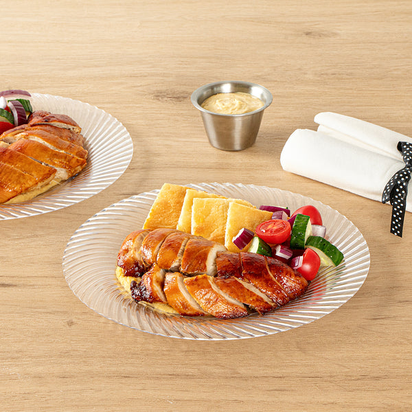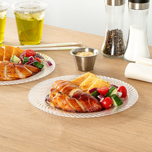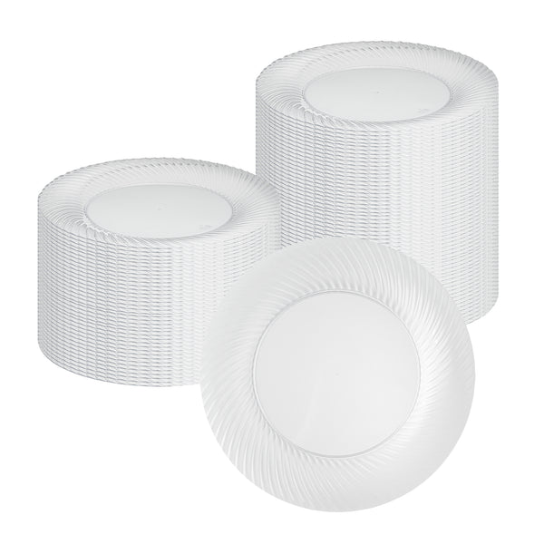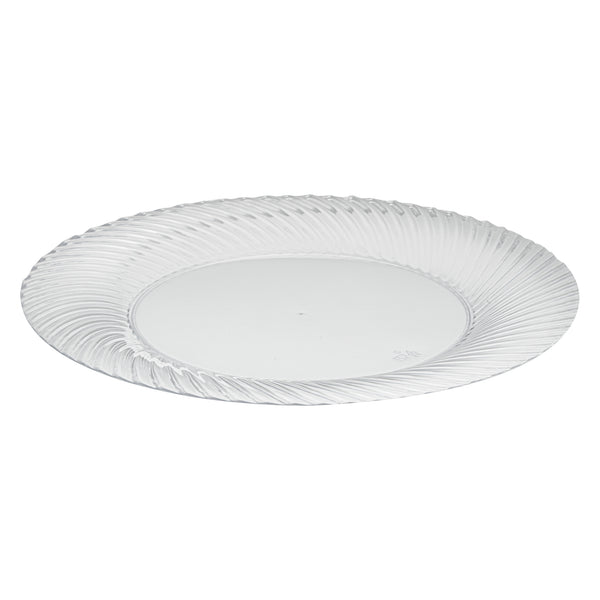 Elevate your table setting with our Moderna Round Clear Plastic Wave Plates. Crafted from durable PS plastic, these dinner plates are robust enough to handle even the heaviest foods. Adorned with an exquisite wave pattern, these plates bring a touch of elegance to your party decor. These premium plastic plates are easily recyclable, minimizing the environmental impact of your event. The heavy-duty design of these dinner plates are greaseproof, keeping your dining experience mess-free. These clear plastic plates can withstand temperatures up to 150F, ensuring optimal serving of warm and cold foods. To minimize washing dishes, these party plastic plates are disposable. Fashioned with a clear finish, these unique plates elevate your food presentation. Measuring 9 inches in diameter, these disposable plates for wedding are ideal for serving all kinds of starters, entrees, and desserts. Shipped in a 200 count box.