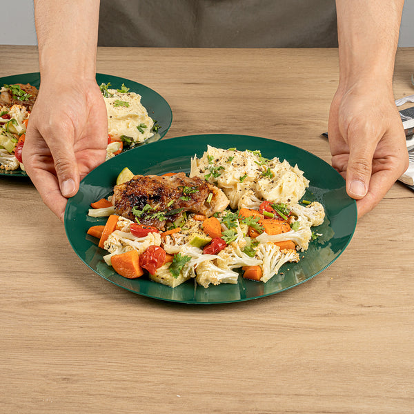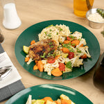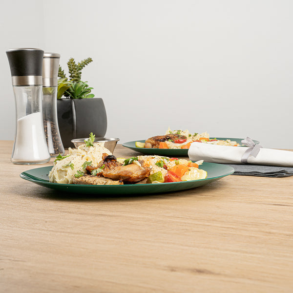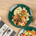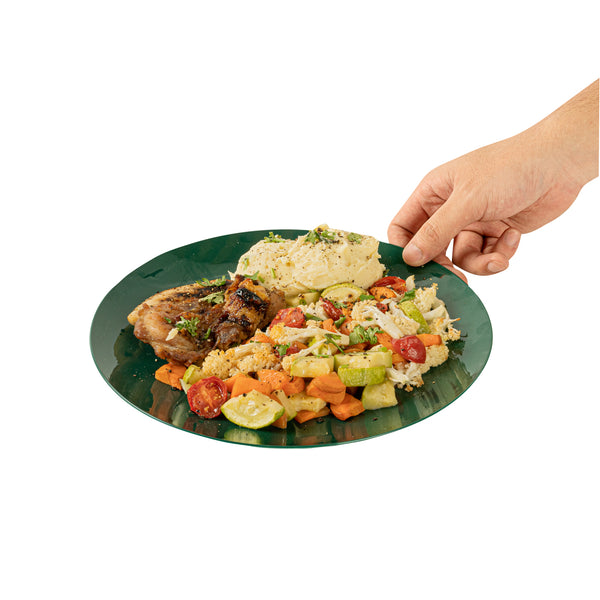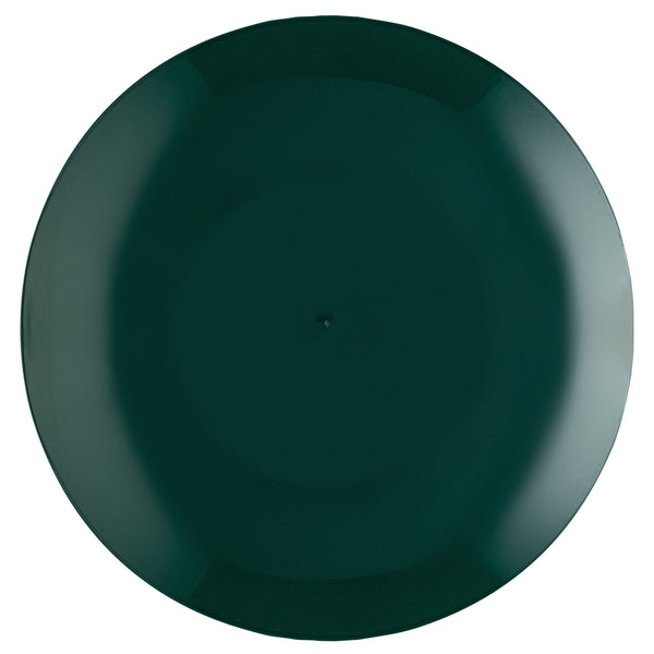 Bring a burst of color to your table with our Moderna Round Forest Green Plastic Plates. Made with durable PS plastic, these fancy dinner plates offer exceptional strength and resilience. Recyclable, these premium plastic plates, help minimize your event's carbon footprint. These forest green plastic plates are engineered to maintain their integrity even at temperatures up to 150F, making them suitable for serving warm and cold foods. Designed with greaseproof properties, these dinner plates maintain a spotty appearance during meals. To simplify clean-up after events, these plastic plates are designed to be disposable, eliminating the need for tedious washing. These party plastic plates, adorned with a forest green finish, infuse a touch of attractive elegance into your table setting. Measuring 10.25 inches in diameter, these elegant plastic plates are ideal for serving all kinds of starters, entrees, and desserts. Shipped in a 40 count box.