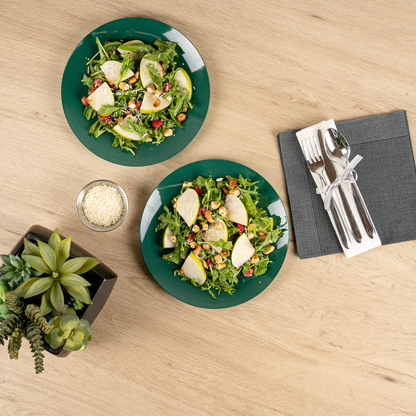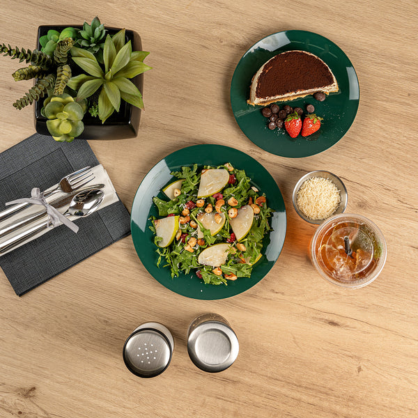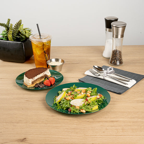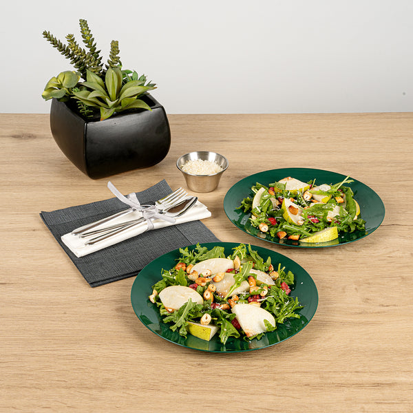 Elevate your dining experience with sophistication. Moderna Green Plastic Plates offer a versatile design that accommodates both warm and cold dishes, making them an essential choice for catering and foodservice professionals looking for reliable plastic plates. Crafted from recyclable plastic, these plates align with eco-friendly initiatives, providing a sustainable alternative to traditional options in your collection of Christmas plastic plates. The elegant forest green finish serves as an eye-catching backdrop that enhances the presentation of culinary creations, ensuring your green disposable plates complement any event’s decor. With a greaseproof surface, these plates keep presentations pristine, whether serving up hot entrees or refreshing salads. Invest in quality and style with this essential addition to your tableware, ideal for holiday gatherings or upscale events. Each order includes 40 Moderna Green Plastic Plates.