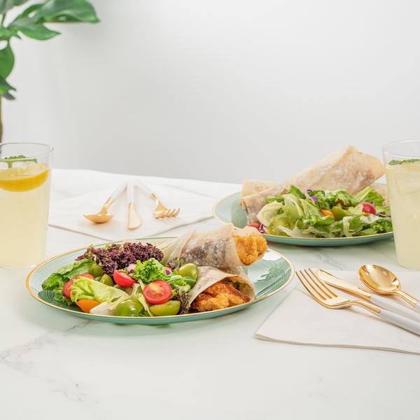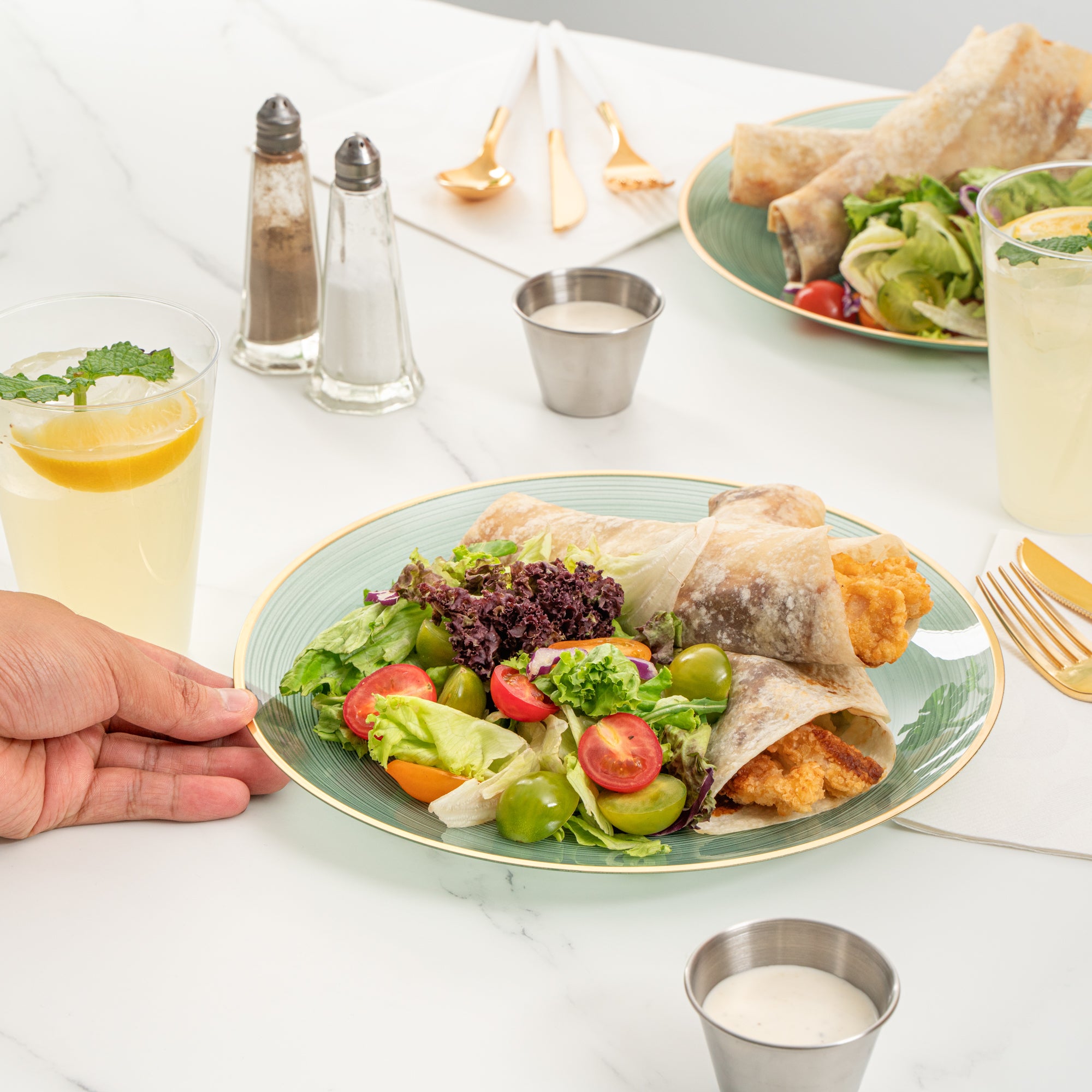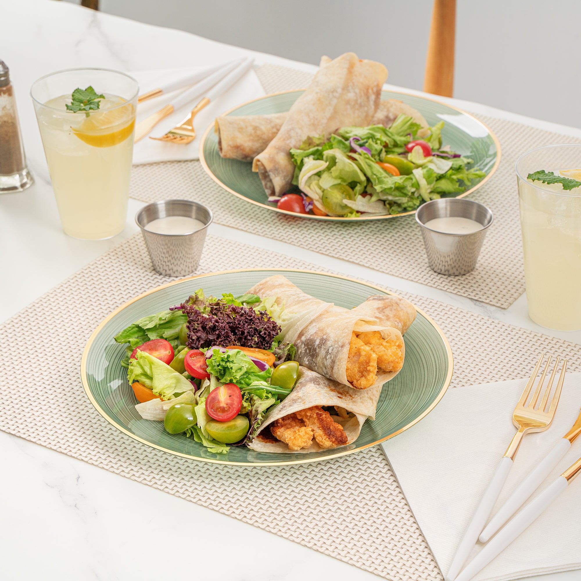Achieve upscale dining aesthetics without sacrificing convenience. The Moderna Elegant Presentation Plastic Dinner Plates offer a rippled surface that ensures secure handling during service, reducing the risk of spills. These elegant disposable plates feature a crystal design that elevates any table setting, perfect for events requiring sophistication and style. With a translucent green color and a gold rim, these wedding plates disposable options transform table presentations, making them ideal for corporate events and upscale catering services. Constructed from durable plastic, these plates withstand the demands of busy foodservice settings, allowing for confidence in serving. Measuring 10.1 inches by 10.1 inches, these plates facilitate fast cleanup, saving time and effort after events. Make a stylish impression at any gathering with plates that offer both elegance and practicality. Each order includes 100 Moderna Elegant Presentation Plastic Dinner Plates.