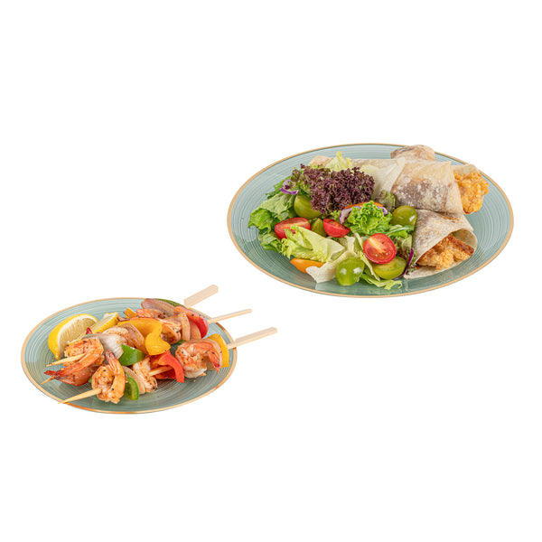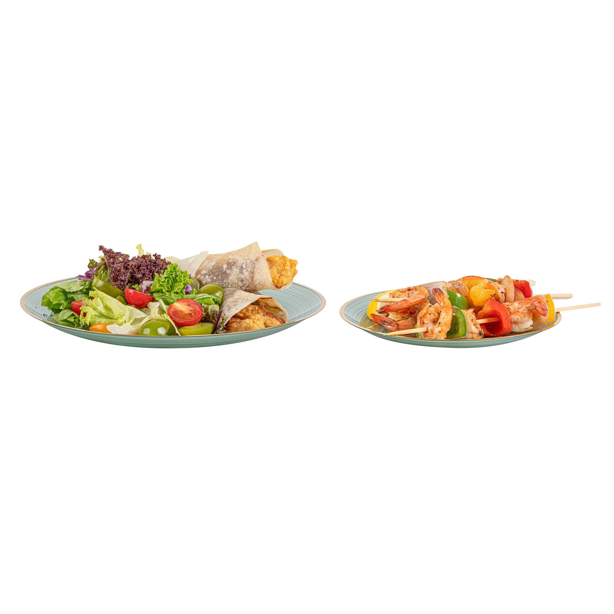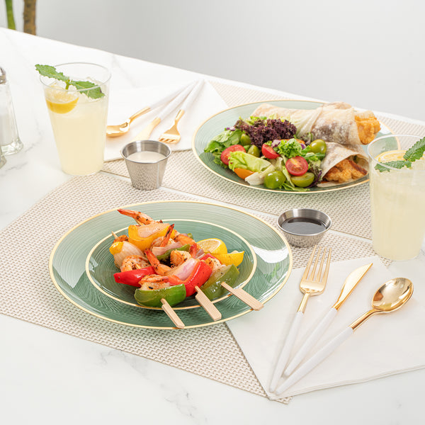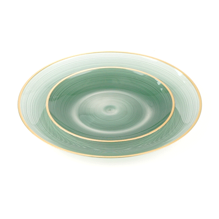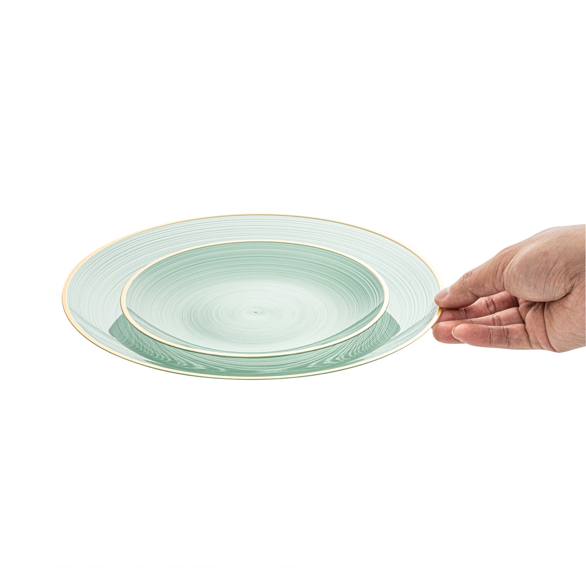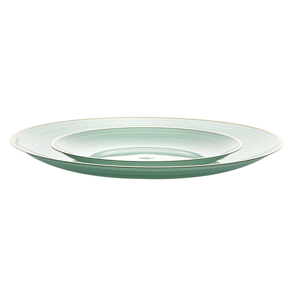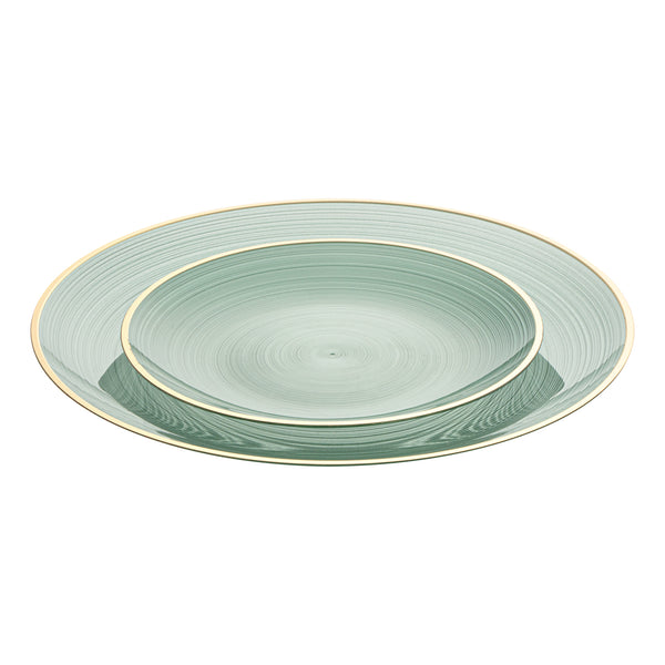 ROUND GREEN TRANSLUCENT PLASTIC GOLD-RIMMED PLATE SET - 7 1/4" AND 10"