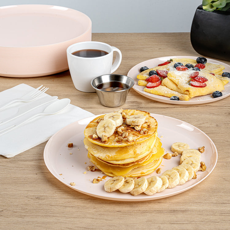 Enhance your dining experience with elegant, greaseproof tableware. Moderna Pink Plastic Dinner Plates feature a versatile design that accommodates both warm and cold foods, making them ideal for serving a wide range of dishes. Crafted from recyclable plastic, these plates provide an eco-friendly alternative to traditional plastic dinnerware, supporting sustainable foodservice operations. The light pink finish of these pink disposable plates adds a touch of sophistication to your culinary presentations, creating an attractive backdrop for any dish. Measuring 10.63 inches by 10.63 inches, these plates offer ample space for entrees and sides, while their durable construction ensures they maintain their shape under the weight of hearty meals. Perfect for events, these stone-look plastic plates combine functionality with aesthetic appeal, helping you meet the demands of busy services. Each order includes 200 Moderna Pink Plastic Dinner Plates.