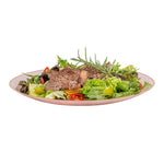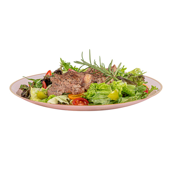 Enhance your event with chic, disposable plastic plates. The Crystal Design Plate Collection offers stunning Moderna Pink Disposable Plastic Plates that seamlessly blend elegance and convenience. These plates feature a rippled design with a gold rim, adding a sophisticated touch to any table setting, ideal for catering events or elegant dining. Crafted from durable plastic, these gold rim plastic plates ensure sturdiness and reliability, perfect for showcasing main courses and large appetizers at weddings and banquets. The translucent pink color provides a unique and stylish appearance, complementing diverse themes. With a 10-inch diameter, these plates offer ample space for your culinary creations. The secure-grip design prevents spills during service, ensuring a smooth dining experience. Embrace effortless cleanups with these disposable plates, saving valuable time and labor costs. Each order includes 100 Moderna Pink Disposable Plastic Plates.