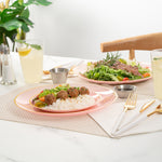 Enhance your dining experience with sophisticated presentation. The Crystal Design Plastic Dinner Plates, part of our chic collection, feature a pink translucent hue and gold-rimmed edge, making them the perfect elegant disposable plates for upscale events. With a rippled texture that adds visual appeal, these plates also boast a secure-grip feature that prevents accidental drops during service, ensuring a seamless dining experience. Made from high-quality plastic, they measure 10.1 inches and 7.13 inches, offering durability for various foods without bending or breaking, ideal for busy catering events. These pink and gold plates are disposable, guaranteeing quick and efficient cleanup after any event, saving time and labor costs. Upgrade your table settings with these stylish plates and enjoy the operational ease they bring. Each order includes 40 Crystal Design Plastic Dinner Plates.