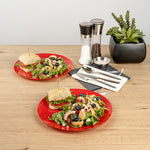 Upgrade your dinnerware collection with our Moderna Round Red Plastic Plates. Crafted from sturdy PS plastic, these fancy dinner plates boast heavy-duty construction. These premium plastic plates can be recycled, reducing the environmental impact of your event. With a temperature resistance of up to 150F, these red dinner plates ensure you can confidently serve warm and cold foods. These dinner plates exhibit resistance to grease, providing a clean dining experience. For your convenience, these unique plastic plates are disposable, saving you from the hassle of washing them after events. With their vibrant red finish, these greaseproof party plastic plates bring a festive element to your tableware. Measuring 10.25 inches in diameter, these plastic plates are ideal for serving all kinds of starters, entrees, and desserts. Shipped in a 200 count box.