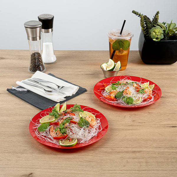 Elevate your table settings with stylish and functional serveware. Moderna Versatile Red Plastic Disposable Plates combine a recyclable design with a vibrant red finish, offering an eco-friendly alternative to traditional plastic plates while enhancing the presentation of your culinary creations. These red disposable plates are crafted from durable plastic, ensuring they remain greaseproof and intact, even when serving a variety of warm and cold dishes. Measuring 9 inches by 9 inches, these plates are perfect for Christmas party plates, accommodating an array of menu items with ease. Their cold and hot food compatibility allows chefs to expand their menu options without worrying about dish warping or melting. Ideal for any occasion, these 9-inch party plates provide a sophisticated yet practical solution for foodservice professionals looking to impress guests. Each order includes 40 Moderna Versatile Red Plastic Disposable Plates.