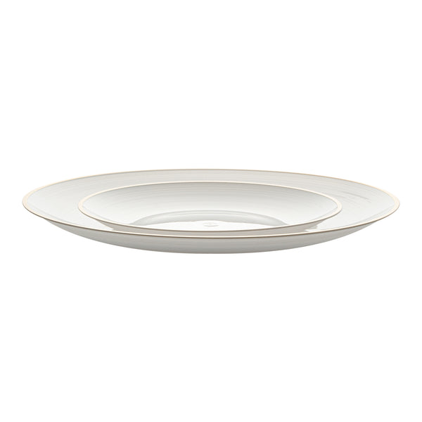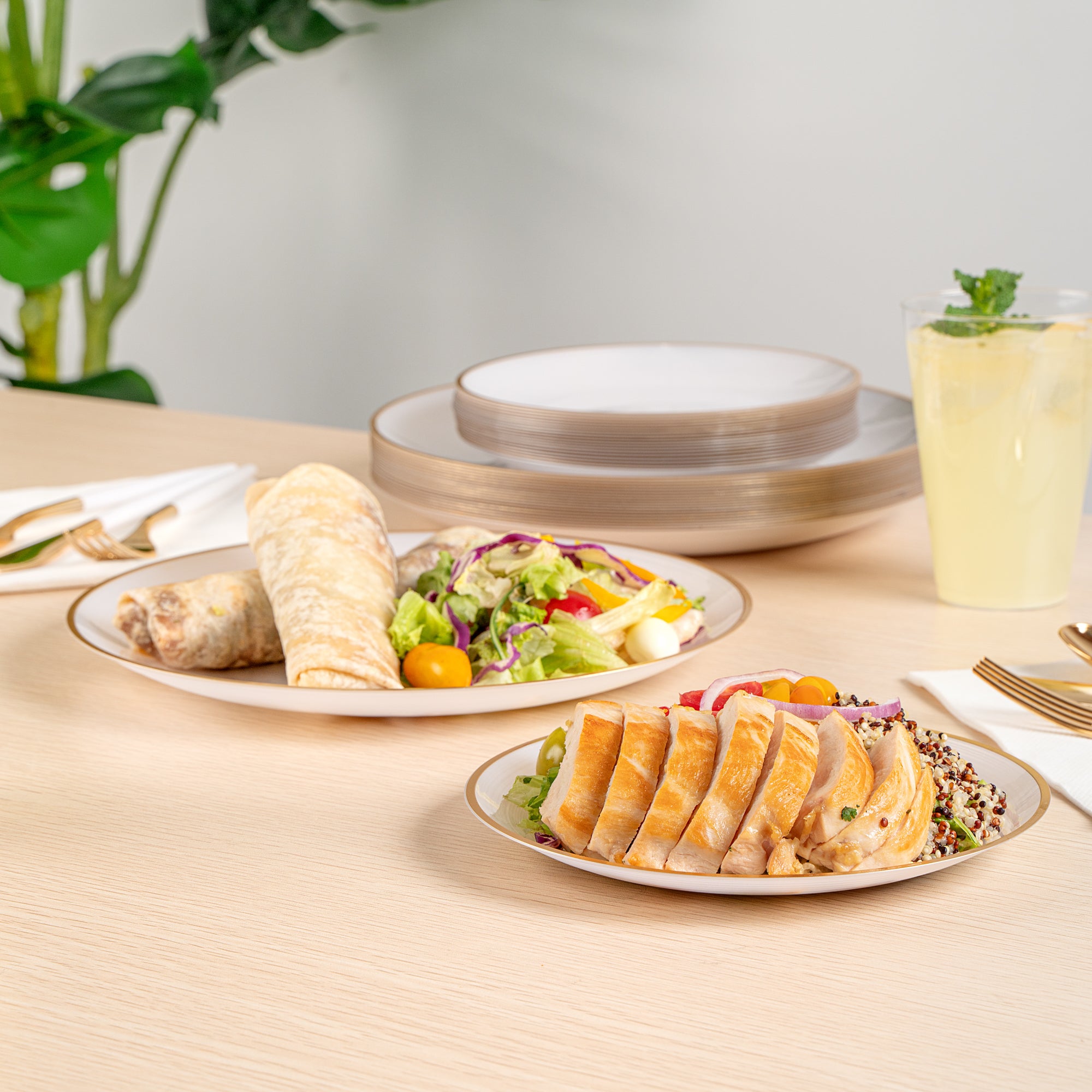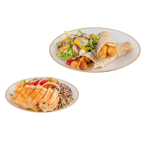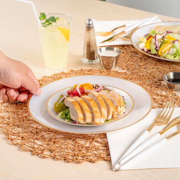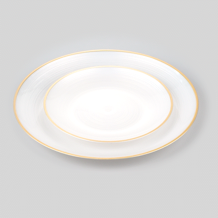 ROUND WHITE TRANSLUCENT PLASTIC GOLD-RIMMED PLATE SET - RIPPLED