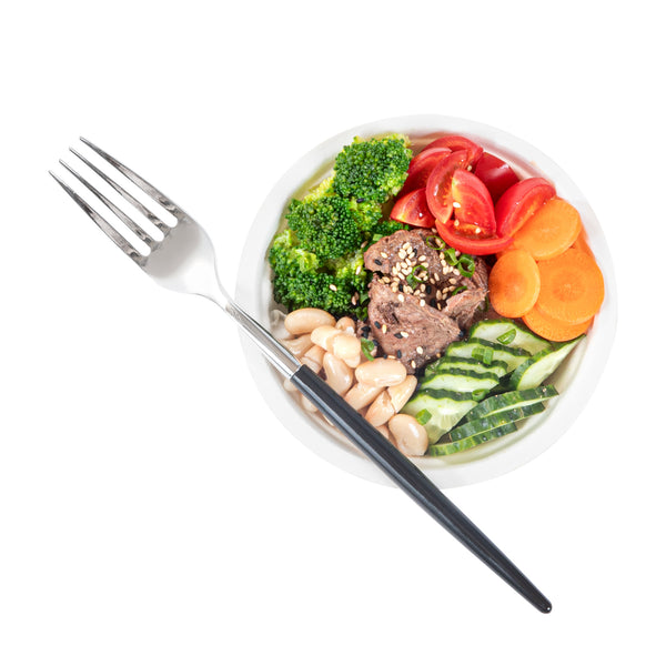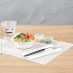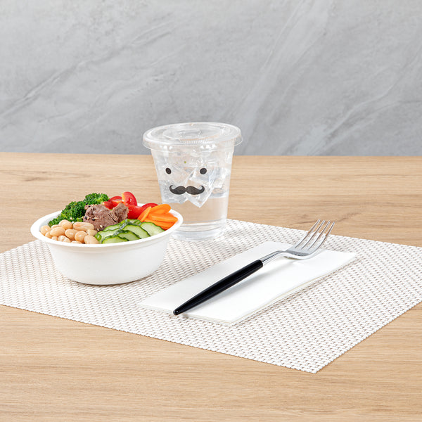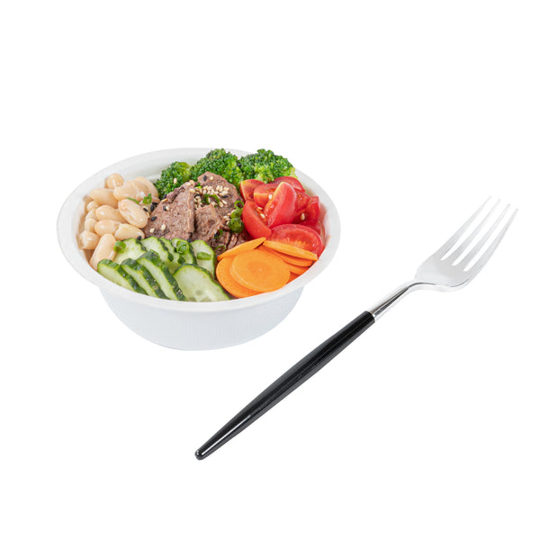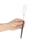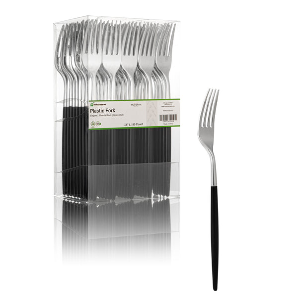 Easily pierce into foods with our Moderna Silver Plastic Forks. Made from durable polystyrene plastic, these plastic forks are durable for poking hard foods. This plastic cutlery doesn't leach unwanted substances into your food. Withstanding 167F, these silver forks handle warm and cold foods effortlessly. These silver forks with black handles are recyclable, minimizing your carbon footprint. For seamless disposal, these fancy plastic silverware are conveniently disposable after large events. The silver and black finish of these fancy plastic utensils adds an elegant touch to your tablescape. Each plastic fork measures 7.5 inches long. Shipped in a 500 count box.