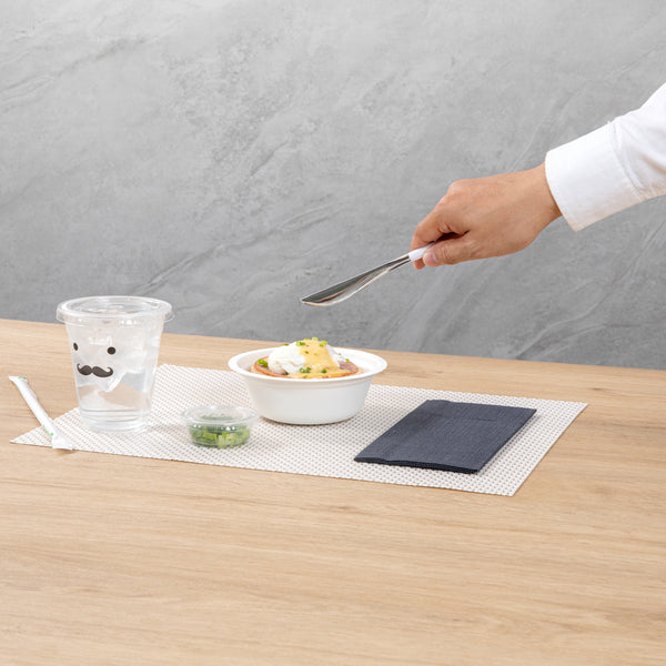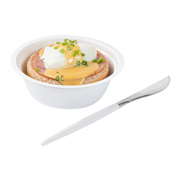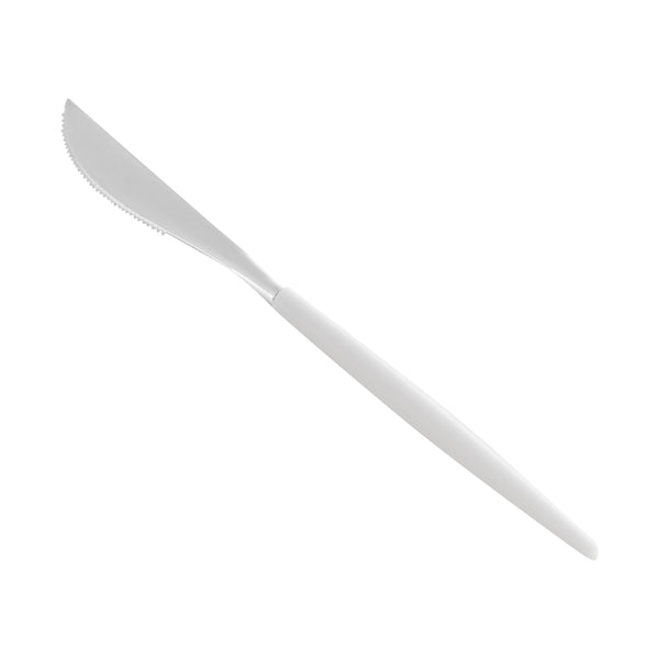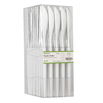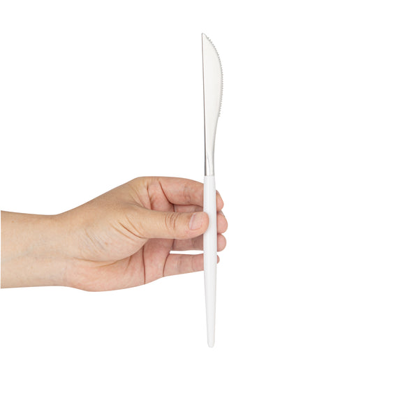 Eat it easy using our Moderna Silver Plastic Knives. These recyclable plastic knives are manufactured using premium plastic are highly durable. The classy white handle of these silver knives lets you hold them comfortably without hurting your hands. The serrated edges of this sharp disposable silverware let you slit meat easily. These disposable plastic knives come in a metallic silver shade, elevating the style of your table settings. Measuring 7.75 inches in length, these plastic knives can be conveniently used for hot or cold foods up to 167F. Sold in a 50 count box.