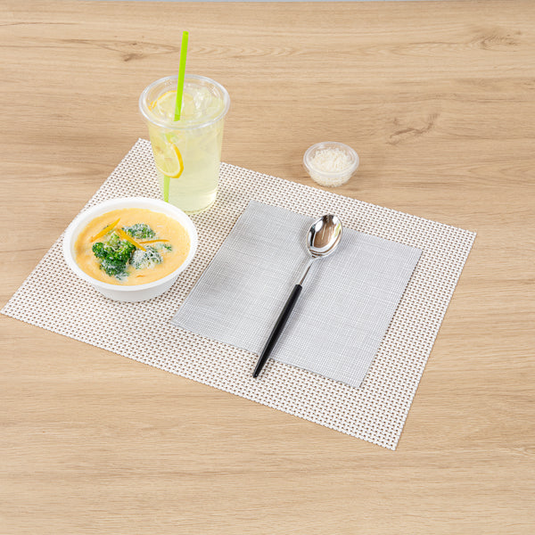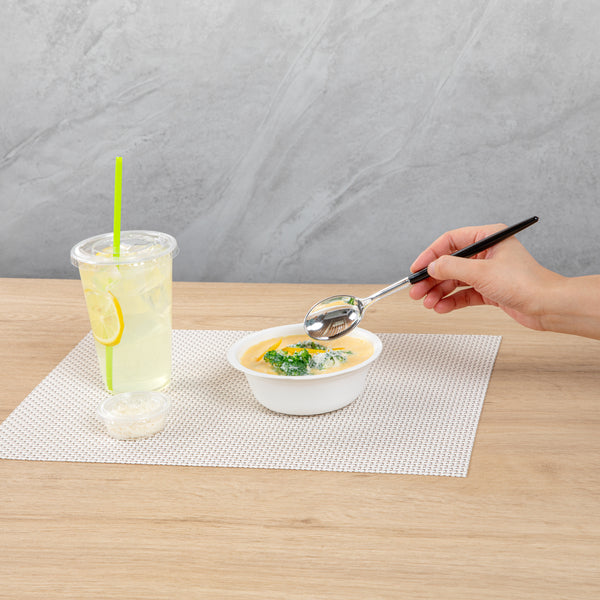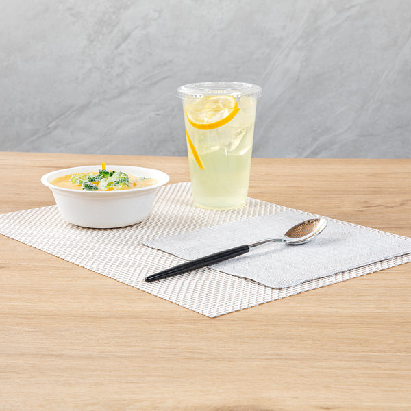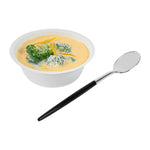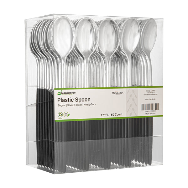Provide a remarkable dining experience with our Moderna Silver Plastic Spoons. Made from polystyrene plastic, these plastic spoons exhibit exceptional durability, making them ideal for scooping and stirring various food items. These plastic utensils are, ensuring no harmful substances leach into your meals. Withstanding temperatures of up to 150F, these silver spoons effortlessly handle both warm and cold dishes. These silver spoons with black handles are recyclable, allowing you to minimize your carbon footprint. For added convenience, these fancy plastic silverware pieces are designed for seamless disposal, especially after large events. Adorned with a stylish silver and black finish, these fancy plastic utensils provide an elegant touch to your tablescape, enhancing the overall aesthetic appeal. Each utensil in this party cutlery set measures 7.75 inches long. Shipped in a 500 count box.