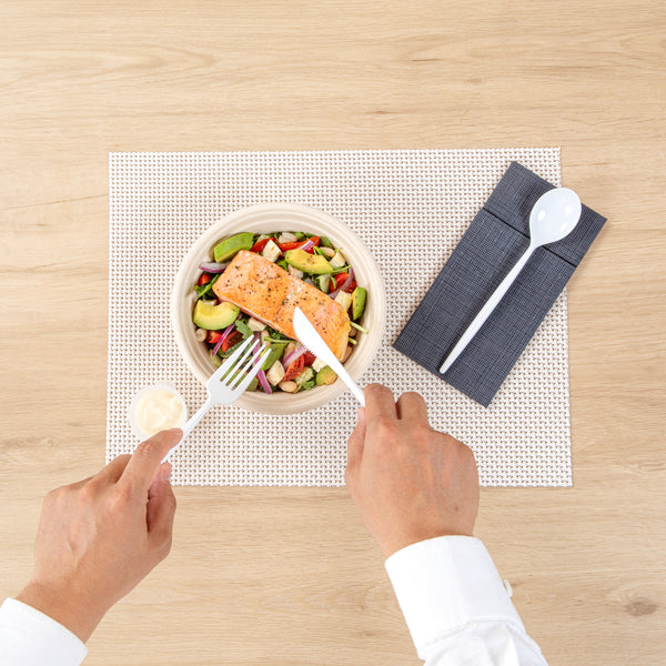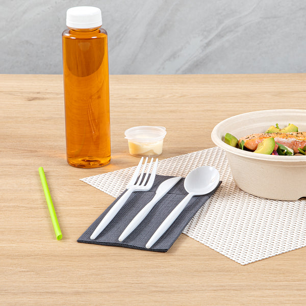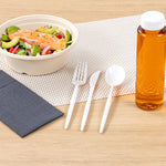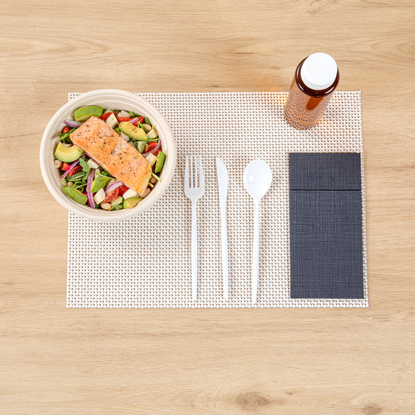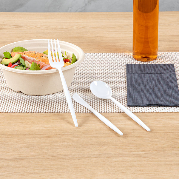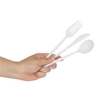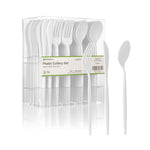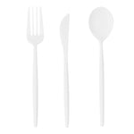 Introduce an air of elegance to your table with our Moderna White Plastic Cutlery Sets. These party cutlery sets comprise top-quality polystyrene utensils, ensuring style and durability. The sturdy handle design of these, heavy-duty plastic flatware sets ensures these utensils won't break, even when used with tough foods. The white finish of these recyclable plastic flatware sets adds a sophisticated flair to your table decor. With 20 forks, 20 knives, and 20 spoons, these disposable flatware sets are perfect for larger events. For a simplified cleanup, these white plastic utensil sets are disposable. Each utensil in these party cutlery sets measures 7.5 inches long. Shipped in a 60 count box.