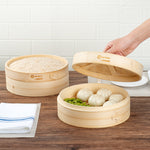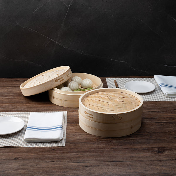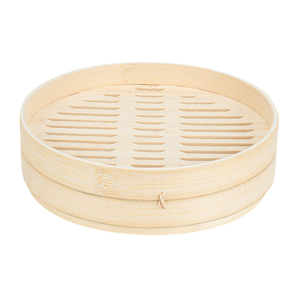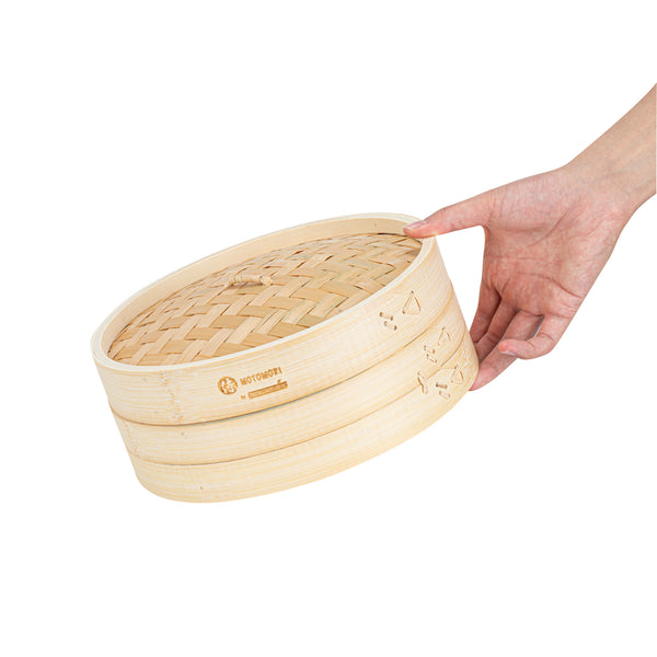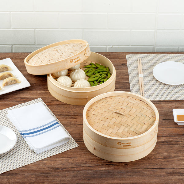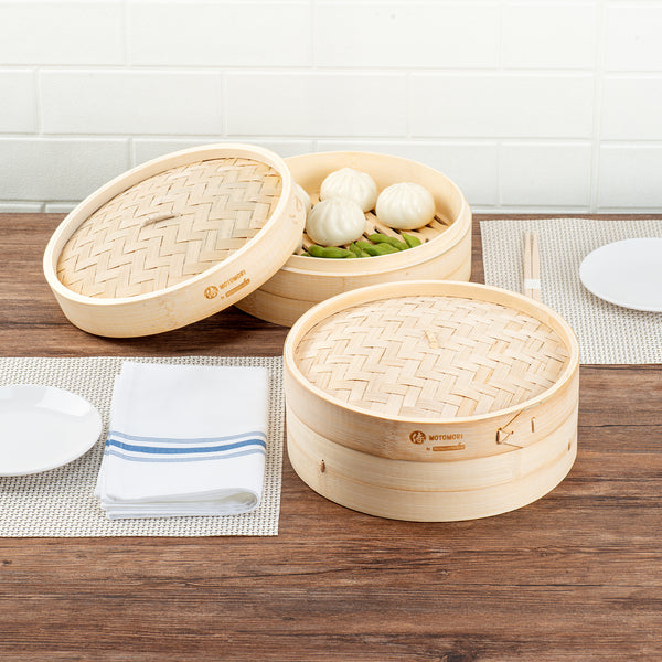 Steam vegetables with our Motomori Round Natural Bamboo Steamers. Each bamboo steamer set comes with a lid and steamer, ensuring a seamless and efficient cooking experience. Designed with attached handles, these bamboo steamers ensure easy handling, simplifying the cooking process and promoting convenience in the kitchen. Crafted from bamboo, these dumpling steamers offer a biodegradable and commercially compostable option designed for multiple uses. For optimal steaming results, rinse and soak these bao bun steamers for approximately 30 minutes before use, ensuring even steam distribution during cooking. These steamer baskets should be set 2 inches above the water level in a wok and can be lined with parchment paper to prevent flavors from steeping into the bamboo. To maintain the impeccable condition of these Chinese steamers, hand wash them in warm water without soap or detergents and allow them to dry thoroughly before storing. These wooden steamers can be stored in a well-ventilated area to keep them fresh and ready for your next cooking adventure. Measuring 10 inches in diameter by 4 inches in height, these bamboo dumpling steamers provide ample space for preparing a variety of Asian dishes. Sold in a 10 count box. These items will only degrade outside of the traditional solid waste stream.