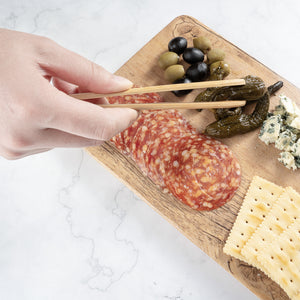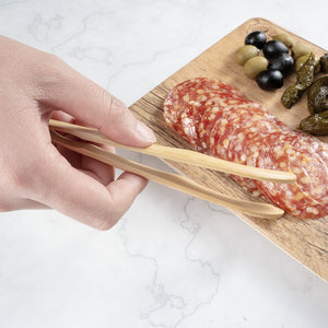 Our Bambuddha Natural Bamboo Curved Tongs provide you with a mess-free way to serve dishes. With a curved tip, these 7-inch tongs allow you to effortlessly pick up foods and precisely plate them. These disposable tongs are commercially compostable and biodegradable, providing you with an eco-friendly to serve dishes and dispose of tongs after use. Featuring a natural bamboo finish, these curve tongs add an elegant touch to your self-serve stations while complementing your serving tools. Each serving tong measures 7 inches in length and provides you with an effortless way to plate breakfast spreads or charcuterie platters. Shipped in a 10 count box. This item will only degrade outside of the traditional solid waste stream. These food tongs are intended for single use but can be handwashed and lightly reused.