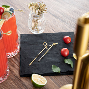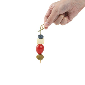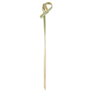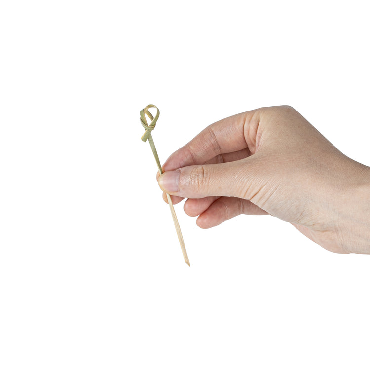 Bring a unique edge to your foodservice with our Pixy Natural Bamboo Twisted Knot Picks. The pointed end allows these biodegradable bamboo picks to move through several food items, ensuring a firm and reliable serving. Suitable for hot and cold dishes, these commercially compostable picks can transform any dining occasion into a special event. These disposable knotted picks are perfect for garnishing cold cocktails or presenting hot bite-sized appetizers in a rustic chic style. With durable construction, these biodegradable twisted cocktail picks do not break or splinter while in use. To make the post-cleanup process simpler, these food picks can be disposed of easily. Each skewer measures 4 inches in length, adding a stylish touch to your upcoming gatherings. Sold in a 1,000 count box.