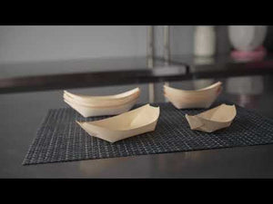 Serve your dishes with sustainable elegance in our Taipei Natural Pinewood Large Food Tray / Boats. Constructed from sustainable pinewood, these food boats are commercially compostable and biodegradable to ensure quick and easy post-event cleanup. Use these disposable food boats as an attractive and streamlined serving solution for large salads, fries, tacos, and other hot or cold foods. These compostable wooden boats feature a strong base and sturdy walls to expertly contain hefty dishes without breaking or bending. Ideal for use at weddings, food trucks, and catered events, these wooden disposable plates can be easily dressed up or dressed down to match the occasion. These disposable pinewood boats are conveniently stackable for space-efficient storage in your commercial kitchen. Each grease-resistant French fry boat measures 4.5 inches long by 2.75 inches wide at the base and 8.75 inches long by 4 inches wide at the top. Sold in a 200 count box.