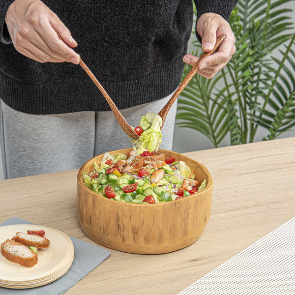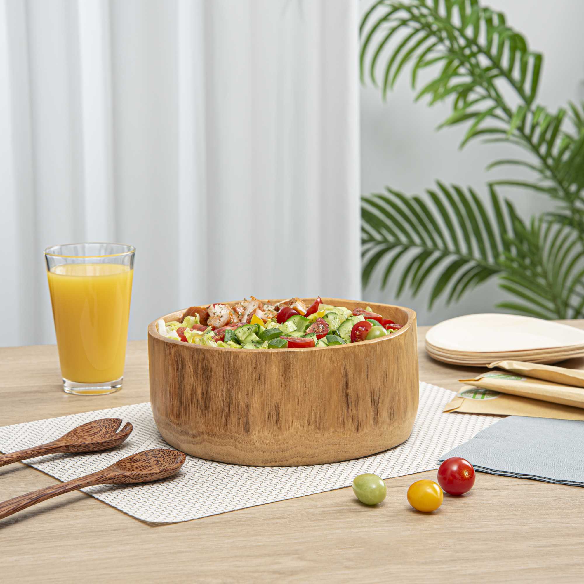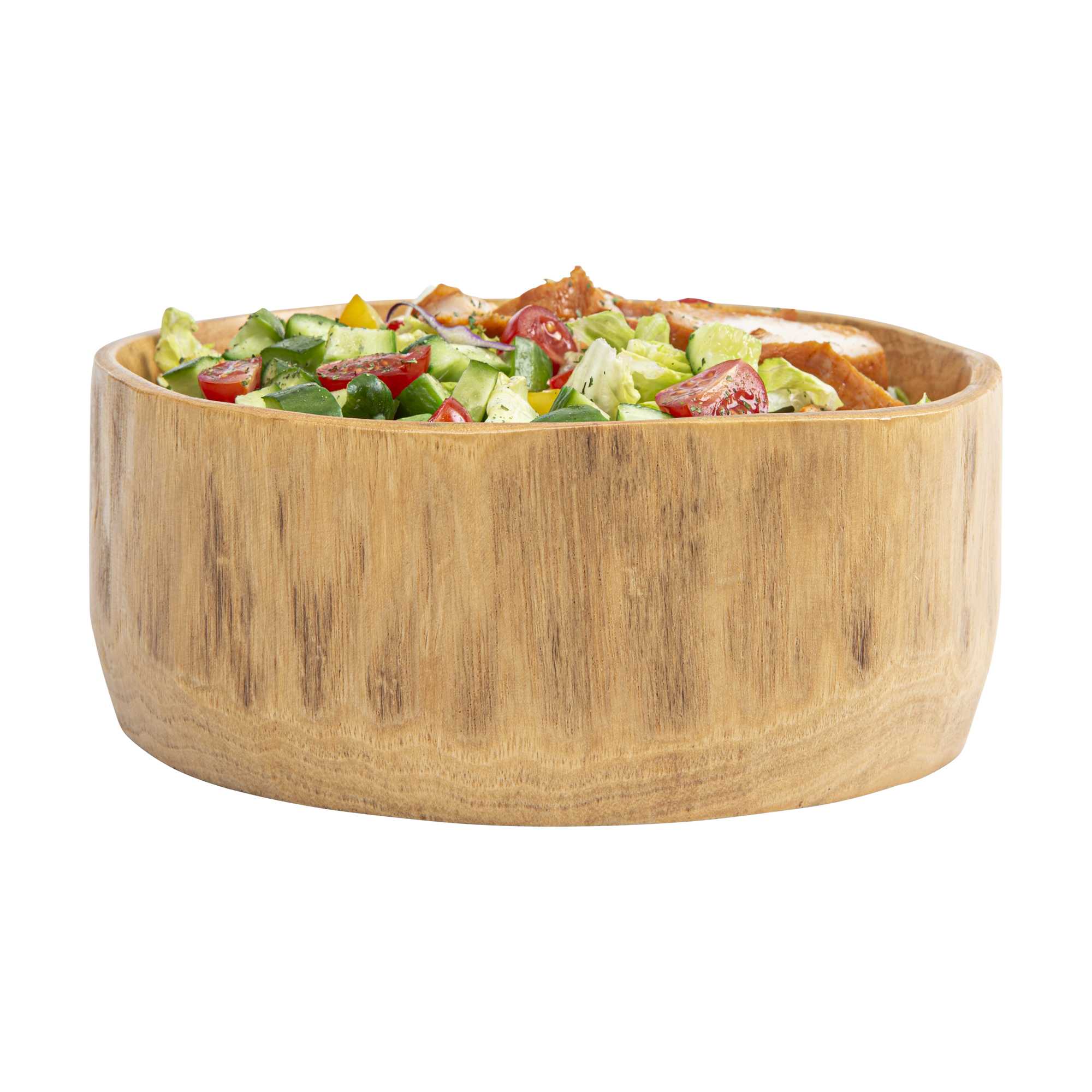 Serve guests with rustic elegance with our Nature Tek 64-ounce Round Natural Wood Serving Bowl. Each stylish serving bowl has its own natural wood grain finish that gives a one-of-a-kind look to your service style at your hotel, catered event, or buffet restaurant. Handcrafted from fast-growing Paulownia wood, this unique serving bowl is lightweight and sustainable to suit the eco-friendly standards of you and your customers. Plus, the durable construction makes it chip-resistant and shatter-resistant to preserve its premium appearance. Designed with a unique shape, this accent bowl contains about 64 ounces of your fresh fruits, salads, or delectable pastas. Featuring straight exterior walls, this pasta serving bowl provides a secure grip for easy handling of entrees to your table. Equipped with a wide base, this salad serving bowl has superior stability on flat surfaces to prevent any accidental messes. The smooth surface of this rustic serving bowl can be quickly wiped down to streamline your cleaning process. This 64-ounce round serving bowl measures around 9.75 inches in length by 8.25 inches in width by 3.5 inches in height. Due to the handmade nature of this sustainable bowl, its approximate size, shape, and color will vary. Ships in 1 count box.