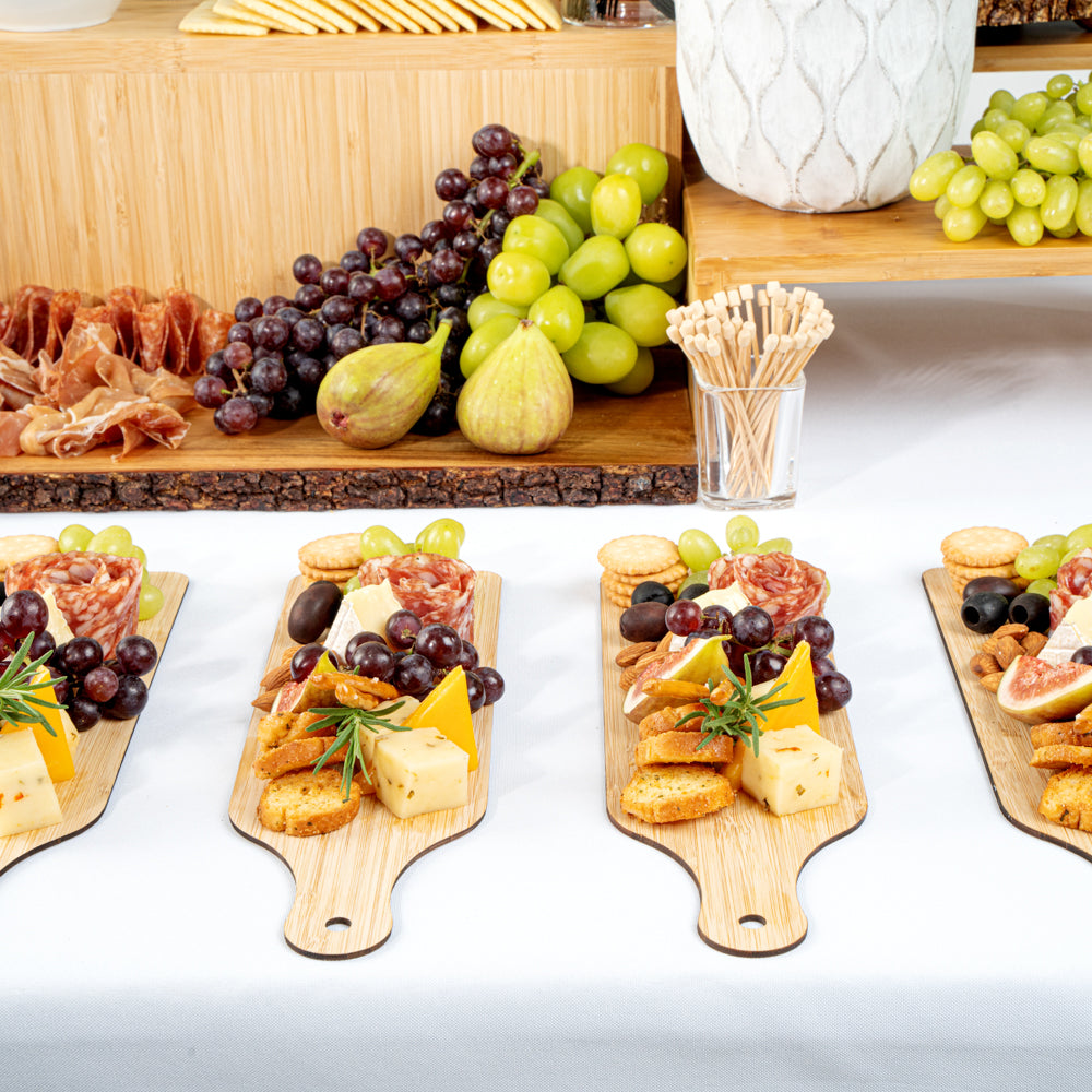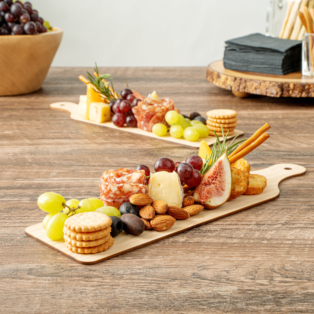 Stylishly serve appetizers and bite-sized treats with our Nature Tek Bamboo Disposable Cheese / Charcuterie Boards. These disposable charcuterie boards are made of natural bamboo that is commercially compostable and biodegradable to provide an eco-friendly option to serve your dishes. These bamboo charcuterie boards are grease-resistant to maintain their classy presentation. The rectangular shape of these disposable charcuterie trays provides ample space to display mini meats, cheeses, or crackers. These disposable cheese boards have a lightweight construction and a built-in handle to easily pass out fare at catered events. For easy cleanup, these bamboo cheese boards are conveniently disposable. To elevate the aesthetic of your food presentation, these disposable cheese trays provide a rustic look. Perfect for small bites, this bamboo cheese tray measures 11.75 inches long by 3.5 inches wide. Sold in a 2 count box. This item will only degrade outside of the traditional solid waste stream.