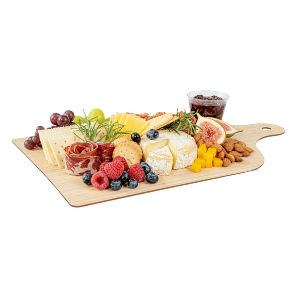 Display and serve small bites with our Nature Tek Bamboo Disposable Cheese / Charcuterie Boards. These disposable charcuterie trays are made from commercially compostable and biodegradable bamboo for a sustainable cleanup process. With a grease-resistant construction, these bamboo cheese trays avoid messes and maintain a professional appearance while serving appetizers. The rectangular shape of these bamboo charcuterie boards offers plenty of space to serve hors d'oeuvres at parties or catered events. These disposable cheese trays have a built-in handle and are lightweight to seamlessly pass out snacks. Featuring a rustic look, these bamboo cheese boards add an elegant touch to your fare. These disposable cheese boards measure 15.75 inches in length by 9.75 inches in width. Sold in a 20 count box. This item will only degrade outside of the traditional solid waste stream.