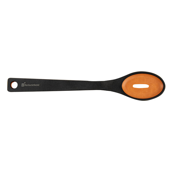 Remove your vegetables from the broth using our Nature Tek Black Wood Slotted Spoon. This black pine wood spoon has a single-slot design suitable for cooking or serving tasks requiring liquid draining. Manufactured from premium wood pulp, this slotted serving spoon is durable to withstand rigorous long-term use. The long handle of this wooden spoon with a slot has a smooth splinter-free surface, providing a comfortable grip for effective handling. With a hole in the handle, you can hang this wooden kitchen spoon anywhere after use to save space on your countertop and for easy access. This wooden spoon has a thick handle that does not conduct heat, letting you filter fried food from grease without burning your skin. With soft edges, this non-stick wooden cooking spoon protects your pots and pans from scratches. The dishwashable feature of this spoon for cooking simplifies the cleaning process and makes it reusable. This wooden slotted spoon for frying measures 13 inches in length by 2.4 inches in width. Shipped in a 1 count box.