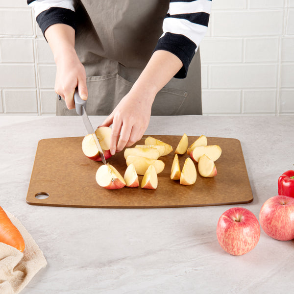 These double-sided cutting boards don't dull knives even after heavy use, as the wood fiber material is gentle on the blades. Can be used with serrated knives too!
