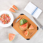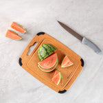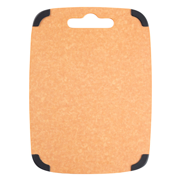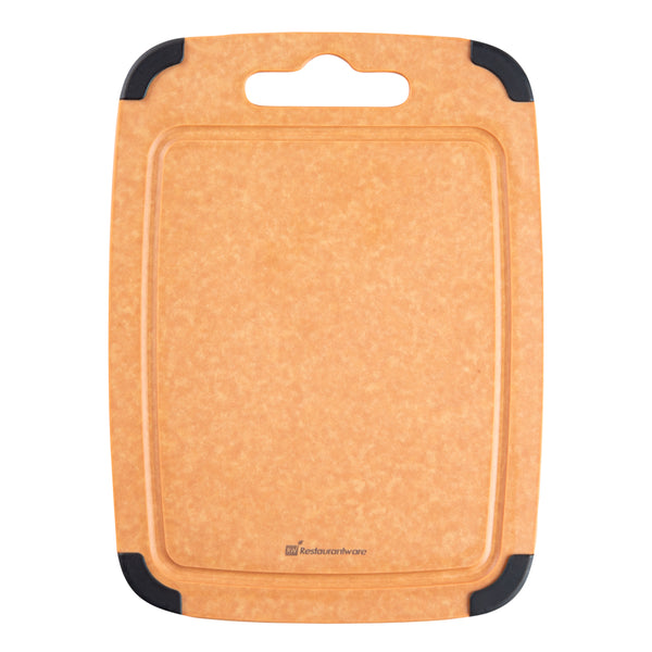 Easily chop vegetables for meals without damaging your countertop by using our Nature Tek Wood Cutting Board. This kitchen board features a juice groove on one side to capture drips from juicy foods. For easy storage, this chopping board is designed with a hanger-hole handle. Made with pine wood composite, this cutting board with a juice groove is lightweight yet durable. This cutting board with a handle comes with silicone pads on all corners to keep the board stable while chopping. With a dishwashable design, this hot- and cold-friendly vegetable cutting board makes post-prep cleaning easier. Withstanding temperatures up to 350F, this natural fiber cutting board can be flipped to be used as a trivet or food serving tray. This non-porous cutting board doesn't allow the harboring of bacteria, by warding off moisture, grease, and odor. The knife-safe surface prevents your blades from getting dull over time. Measuring 14.5 inches long by 10.75 inches wide, this wood composite cutting board is ideal for chopping multiple veggies for meal prep. Shipped in a 1 count box.
