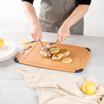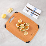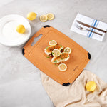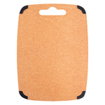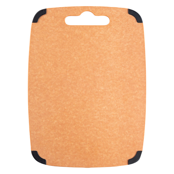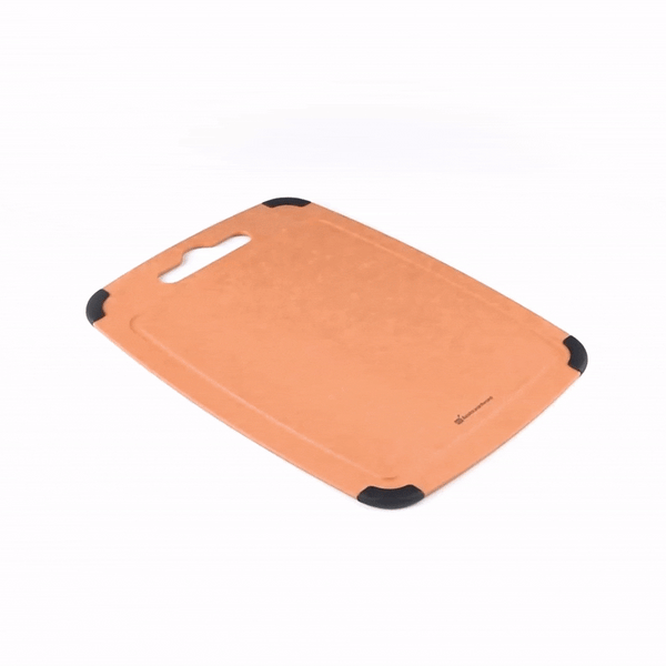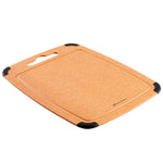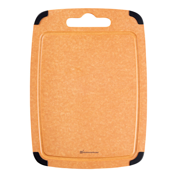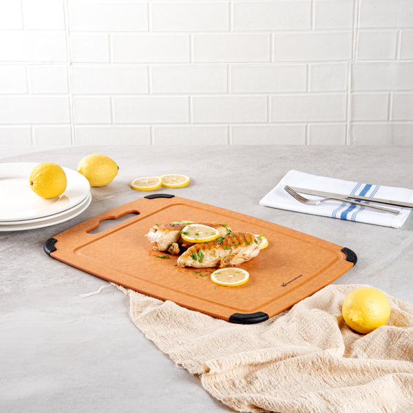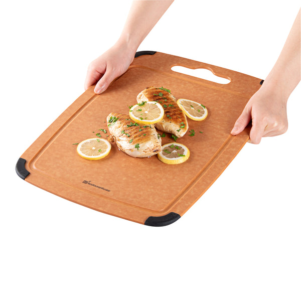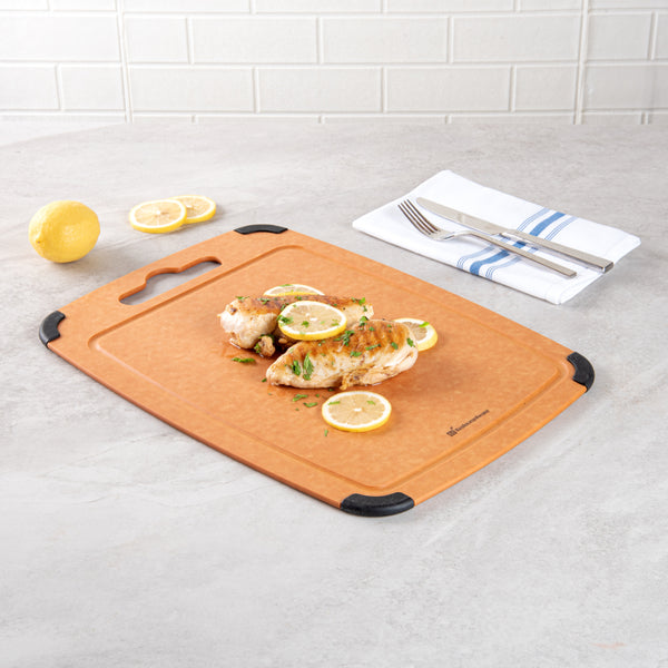 Protect your countertops while enjoying mess-free chopping with our Nature Tek Wood Cutting Board. This vegetable cutting board is designed with a juice groove around the perimeter for a spill-free cutting experience. With a built-in hanger hole handle, this chopping board can be easily stored by hanging it from a hook. Made with pine wood composite, this cutting board with a handle is heavy-duty while being lightweight for easy handling. Featuring silicone corner pads, this cutting board with a juice groove won't slip from the countertop. Flip this wood composite cutting board for a non-grooved serving platter for hot or cold foods. Resistant to temperatures up to 350F, this dishwashable kitchen board serves as trivets for hot pots or pans. The non-stick material of this wood fiber chopping board won't absorb odor, moisture, or grease, preventing bacteria from harboring on the surface. This non-slip chopping board is knife-safe, keeping your blades sharp, and allows use with serrated knives. Measuring 17.25 inches long by 12.75 inches wide, this chopping board is perfect to carve fish, meats, or multiple food items. Shipped in a 1 count box.