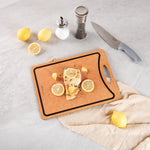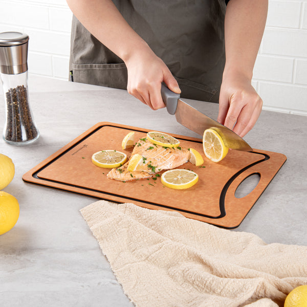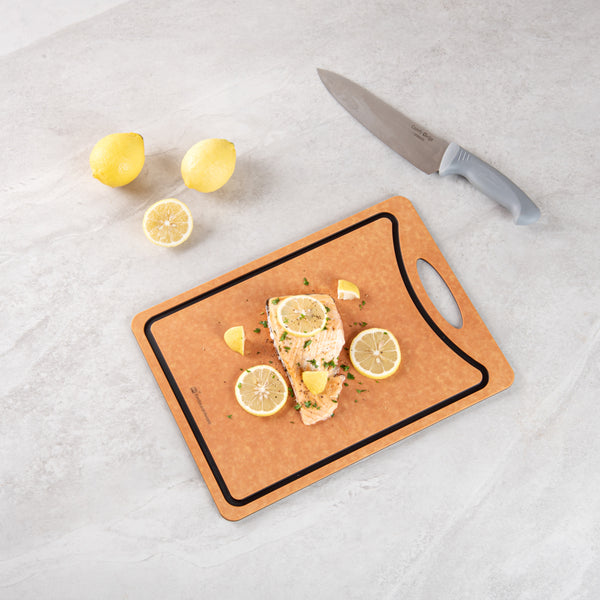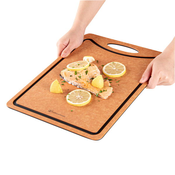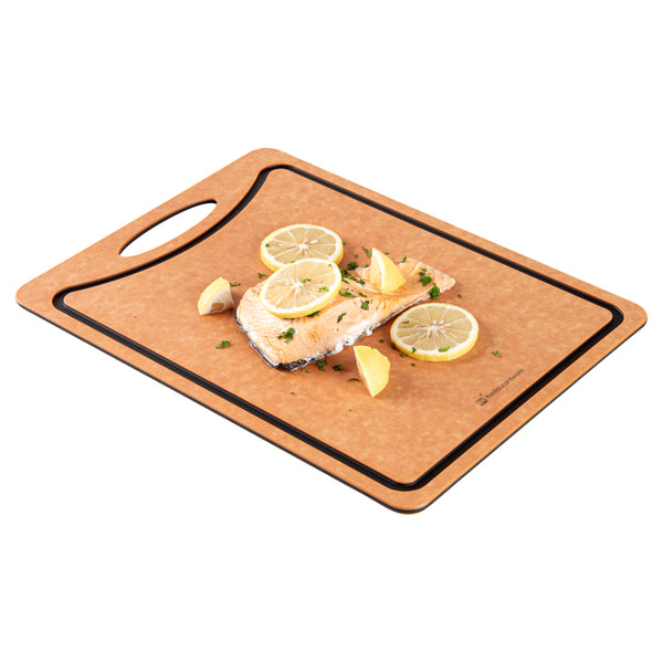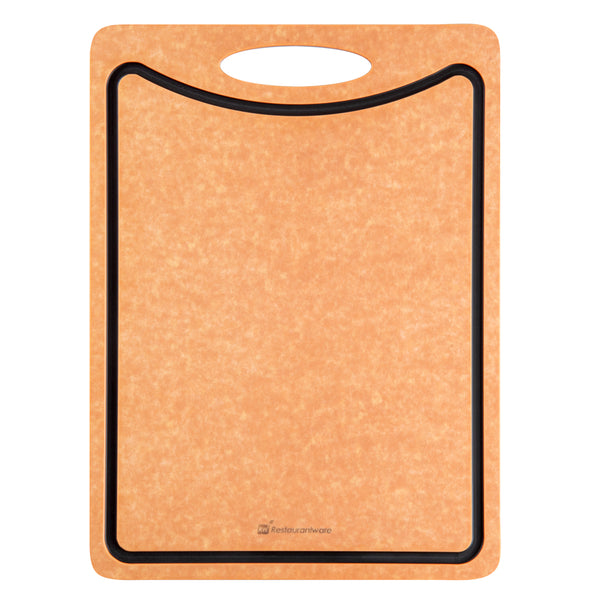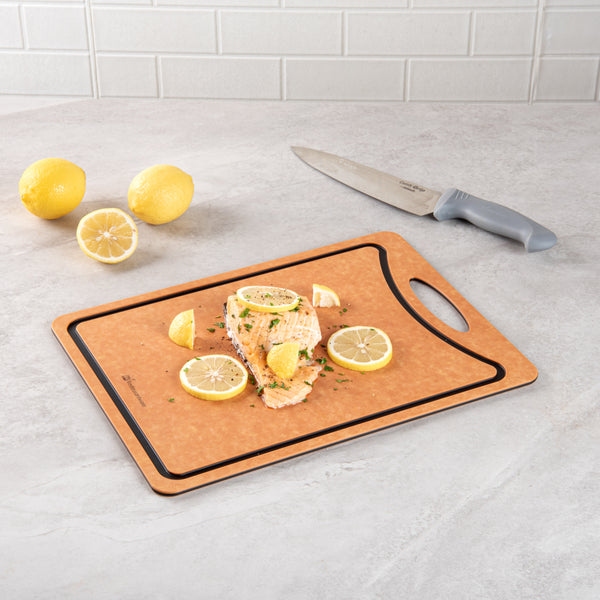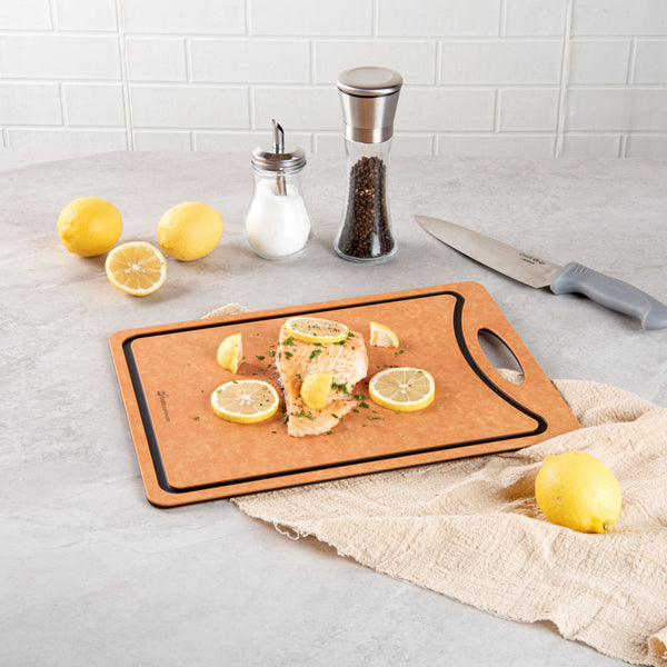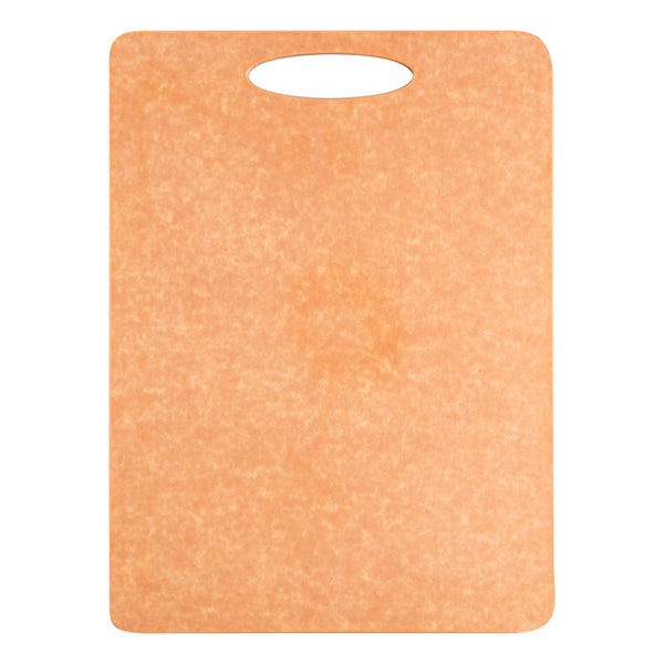 Protect your kitchen countertop from knife marks and stains with our Nature Tek Wood Gourmet Cutting Board. Manufactured with pine wood composite, this natural fiber cutting board is long-lasting and heavy-duty. This chopping board is built with an integrated drip groove around the perimeter to capture juice and food runoffs, avoiding spills all over the countertop. Flip this wood composite cutting board for a groove-free, flat, food prep surface. This gourmet cutting board is designed with a built-in oval handle for easy handling or hanging. Featuring a moisture-resistant, non-stick surface, this rectangle kitchen board won't absorb odors or oils, avoiding the harboring of bacteria. This wood carving board doesn't dull knives over time, as the knife-safe, softwood material is gentle on blades, and safe to use with serrated knives. Resistant to temperatures up to 350F, this standard-size cutting board can be used as a trivet. This dishwashable cutting board with juice groove shortens your cleaning process after prepping food. The dual-tone design of this wood fiber chopping board provides a rustic elegance to your kitchen. Measuring 14.5 inches long by 10.75 inches wide, this lightweight wooden chopping board provides ample room to cut up multiple food items. Shipped in a 1 count box.