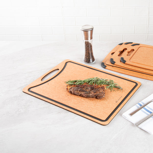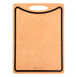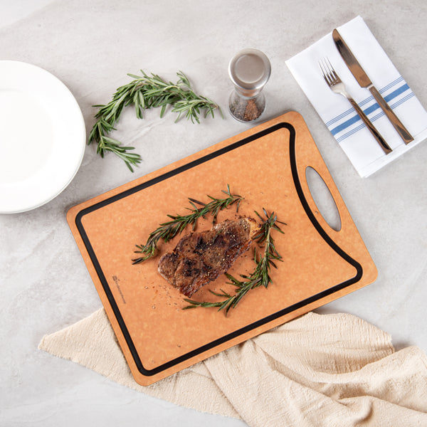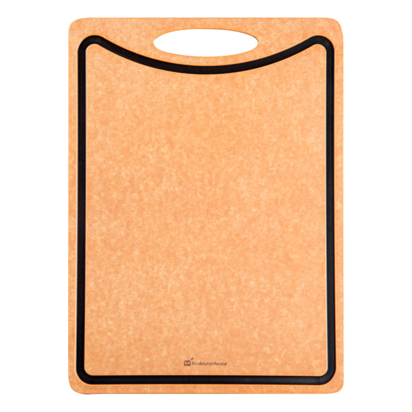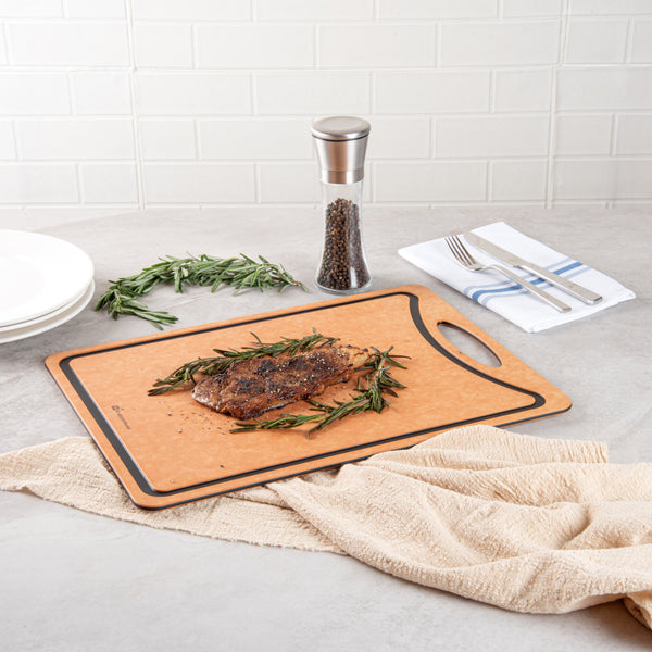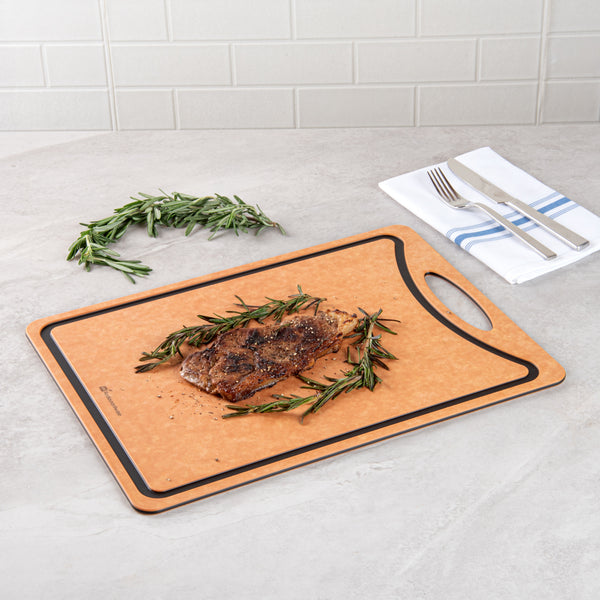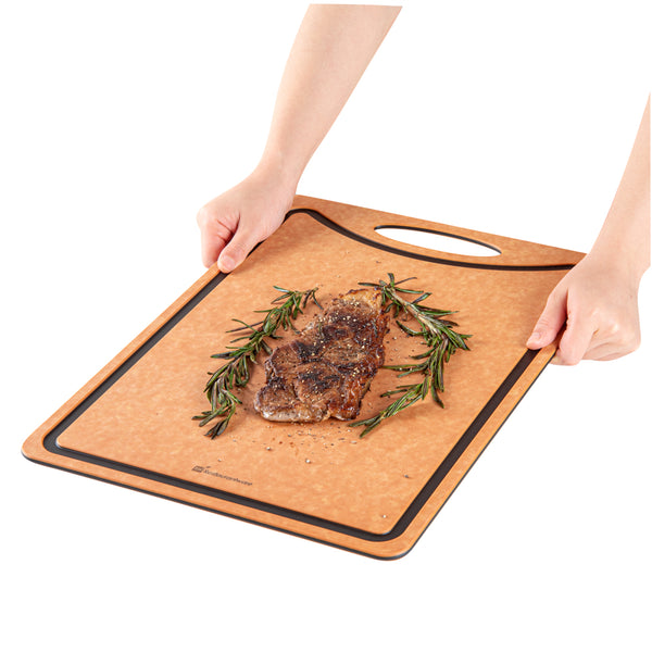 Cut up meats and vegetables in a mess-free manner with our Nature Tek Wood Gourmet Cutting Board. Made with pine wood fibers, this wood composite cutting board is durable yet lightweight. This vegetable cutting board features an oval handle for comfortable use and space-efficient storage. With an integrated juice groove on one side, this chopping board captures liquids before it gets to the countertop. The non-grooved side of this kitchen board can be used as a food-prep tray or serving tray. This wooden chopping board is dishwasher-safe for effortless cleaning. To maintain hygiene and to resist bacteria, this non-stick natural fiber cutting board won't absorb moisture or odors. The hot and cold-friendly surface of this carving board is heat-resistant up to 350F, enabling you to use it as a trivet. This knife-safe cutting board with juice groove prevents your blades from becoming dull over time and is safe to use with serrated knives. With a dual-tone design, this gourmet cutting provides a rustic look to match the environment of your kitchen while keeping it clean. Measuring 17.25 inches long by 12.75 inches wide, this standard-size cutting board provides ample room to cut up multiple food items. Shipped in a 1 count box.