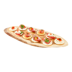 Bring a rustic touch to your serveware with this Eco Display Oblong Acacia Wood Serving Board! Designed with a natural bark trim, this wooden serving plank looks great included in earthy tablescapes or elegant centerpieces. This unique serving dish is quite large and features a rustic-inspired oblong shape that's perfect for presenting a selection of miniature appetizers or an assortment of aged cheeses. Crafted from all-natural acacia wood, this rustic serving platter is built to be long-lasting, durable, and beautiful. Ideal for restaurants, cafes, and catering companies, each of these serving boards is finished with an attractive food-safe varnish. This wooden serving board measures 20 inches long by 8 inches wide. Shipped in a 1 count box.