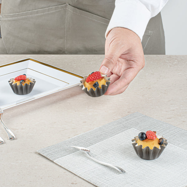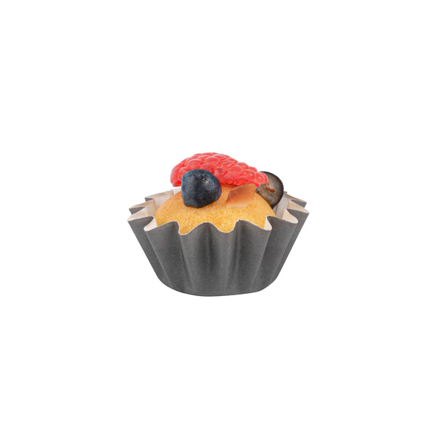 Enhance your bakery's presentation with effortless release. Panificio Grease-Resistant Mini Baking Cups feature a specialized grease-resistant coating, ensuring mini cakes and muffins release smoothly, minimizing mess and maximizing efficiency. These round muffin liners are crafted from heavyweight paper, expertly designed to withstand oven temperatures up to 425 degrees Fahrenheit, making them ideal for consistent baking results. The flared design of these disposable cupcake cups accentuates and frames your baked creations, highlighting their artisanal appeal and drawing customers' attention to your delicious offerings. Measuring 2 inches in length and width, with a height of 0.6 inches, these gray paper liners provide a reliable solution for both baking and display, enhancing the overall foodservice experience. Upgrade your bakery essentials today with these versatile mini baking cups. Sold in a 200 count box.