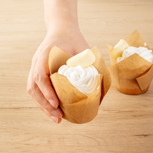 Enhance your dessert presentation with elegant, functional liners. Panificio Greaseproof Tulip Baking Cups feature a greaseproof coating that ensures easy removal of cupcakes and muffins, minimizing waste and labor during cleanup. The beautiful tulip design of these 3.5-ounce kraft cupcake liners showcases your baked creations, elevating their visual appeal and enticing customers. Crafted from heavy-duty paper, these liners maintain their 3.15 inches height, holding their shape during baking and serving, ensuring consistent performance in busy kitchens. Made from paper, they are oven-safe and recyclable, offering a sustainable option for eco-conscious bakeries. Elevate your bakery's efficiency and presentation with these versatile greaseproof baking cups. Sold in a 50 count box.