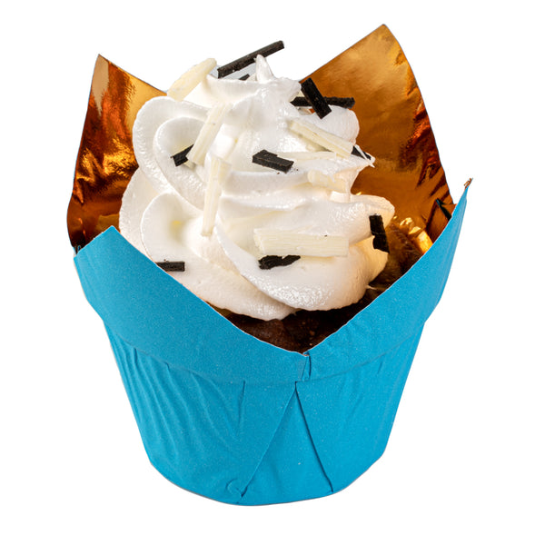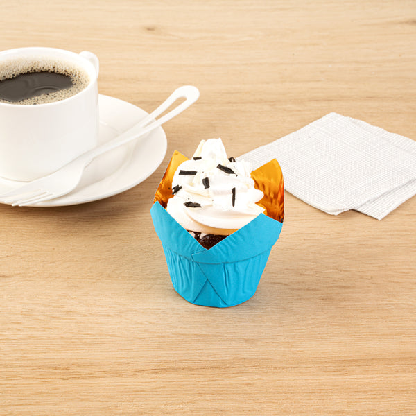 Enhance your bakery's presentation with stylish, greaseproof liners. Panificio Greaseproof Blue Tulip Cupcake Liners feature a greaseproof coating that ensures easy removal of baked goods, making them an essential item for efficient service. Designed with a beautiful tulip shape, these liners beautifully showcase your muffins and cupcakes, enhancing their visual appeal and creating an impressive display for customers. Made with heavy-duty foil paper, these liners maintain their shape in high-heat ovens, guaranteeing consistent results and reliability for your baking needs. Measuring 3.35 inches in width and 2.75 inches in height, these foil baking cups provide ample space for your treats while ensuring a sturdy base. Elevate your dessert presentations and streamline your baking process with these dependable muffin paper cups. Each order includes 50 Panificio Greaseproof Blue Tulip Cupcake Liners.